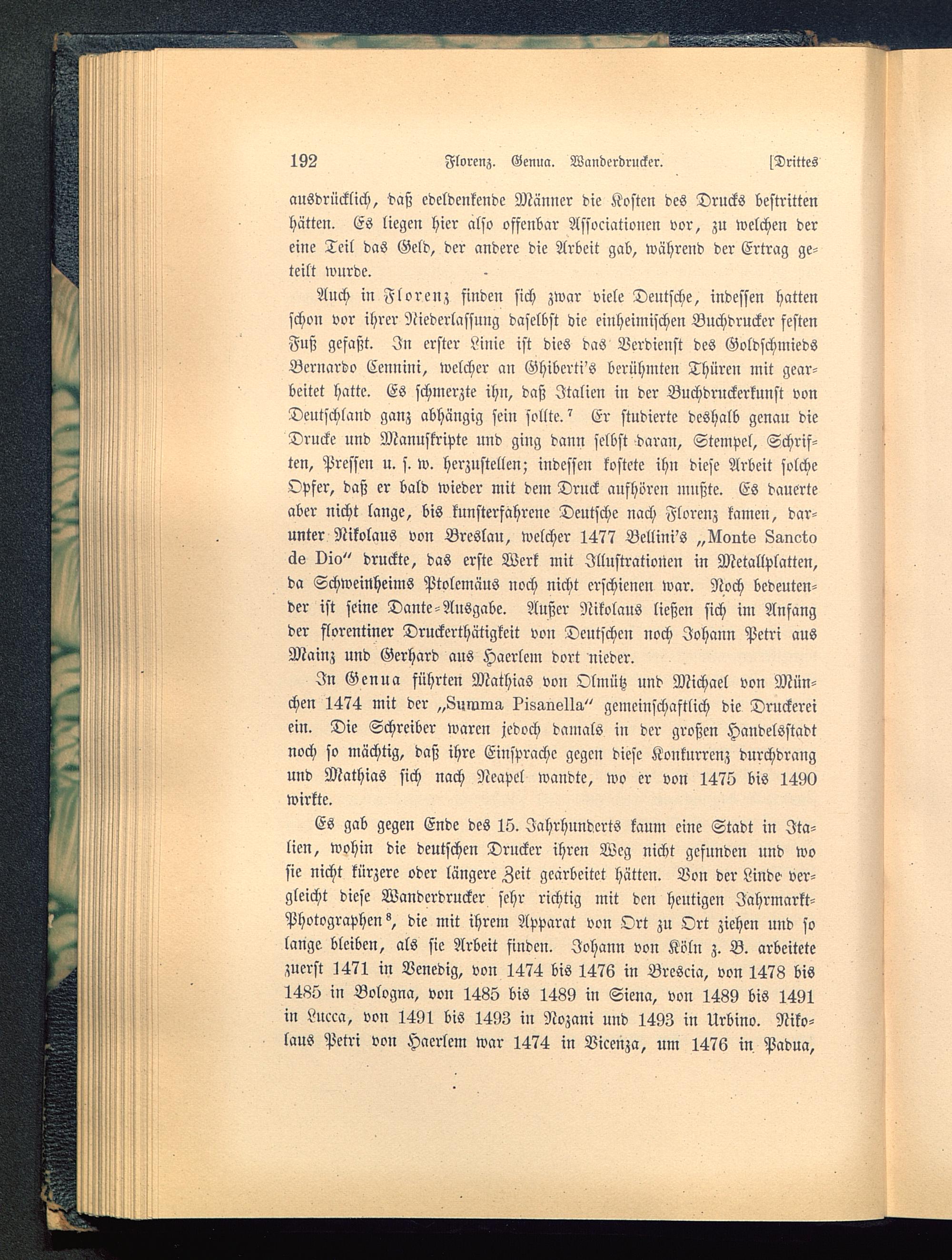In Genua führten Mathias von Olmütz und Michael von Mün-chen 1474 mit der „Summa ^iss-velln" gemeinschaftlich die Druckereiein. Die Schreiber waren jedoch damals in der großen Handelsstadtnoch so mächtig, daß ihre Einsprache gegen diese Konkurrenz durchdrangund Mathias sich nach Neapel wandte, wo er von 1475 bis 1490wirkte.