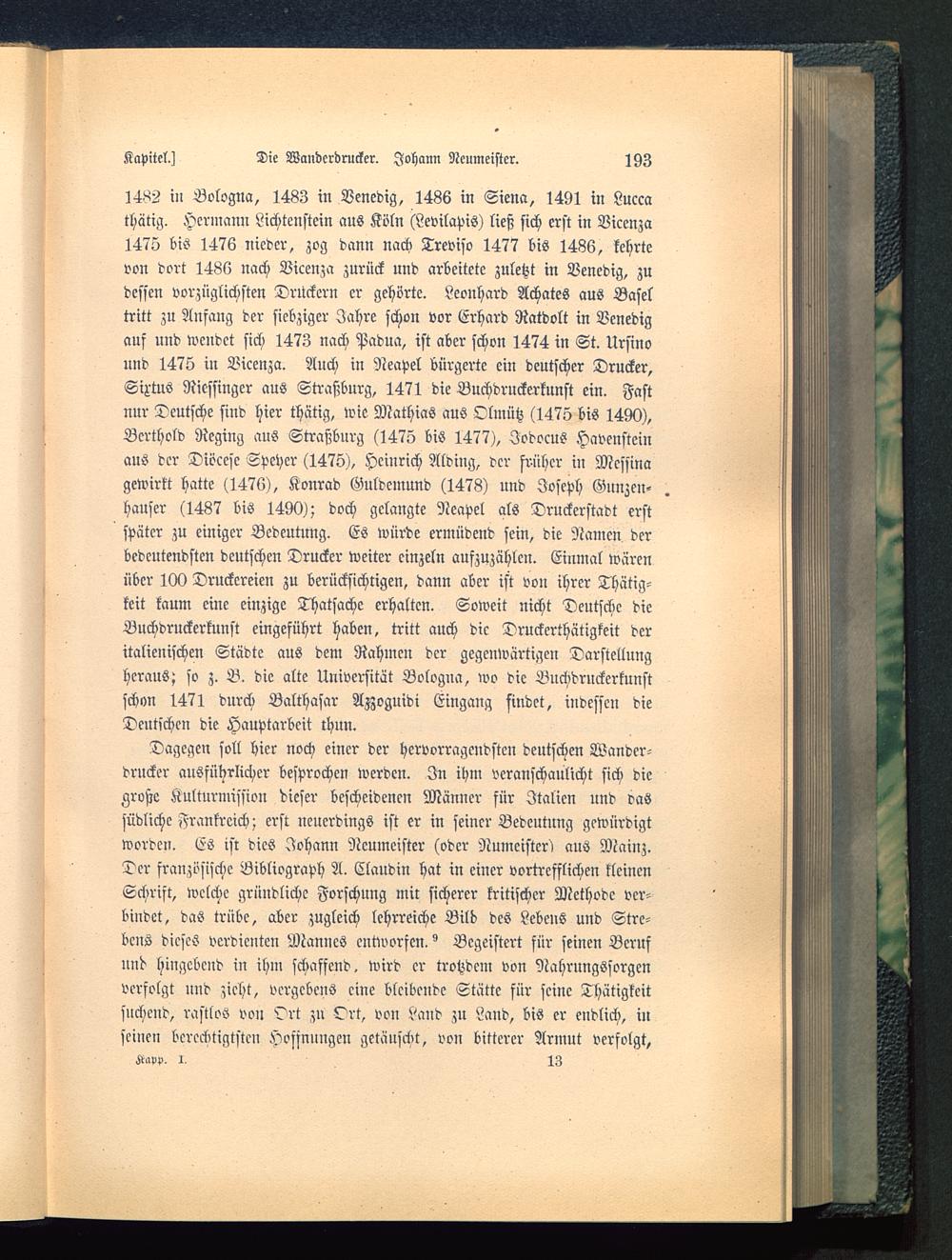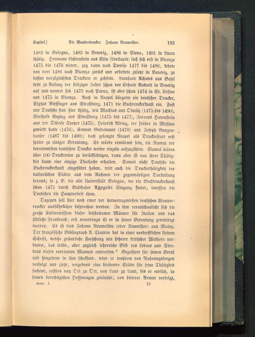 Dagegen soll hier noch einer der hervorragendsten deutschen Wander-drncker ausführlicher besprochen werden. In ihm veranschaulicht sich diegroße Kulturmission dieser bescheidenen Männer für Italien und dassüdliche Frankreich ; erst neuerdings ist er in seiner Bedeutung gewürdigtworden. ES ist dies Johann Ncumeister (oder Numeister) aus Mainz .Der französische Bibliograph A. Claudin hat in einer vortrefflichen kleinenSchrift, welche gründliche Forschung mit sicherer kritischer Methode ver-bindet, das trübe, aber zugleich lehrreiche Bild des Lebens und Strc-bcns dieses verdienten Mannes entworfen." Begeistert für seinen Berufund hingebend in ihm schaffend, wird er trotzdem von Nahrungssorgenverfolgt und zieht, vergebens eine bleibende Stätte für seine Thätigkeitsuchend, rastlos von Ort zu Ort, von Land zu Land, bis er endlich, inseinen berechtigtsten Hofsnnngen getäuscht, von bitterer Armut verfolgt,K»pp, 13