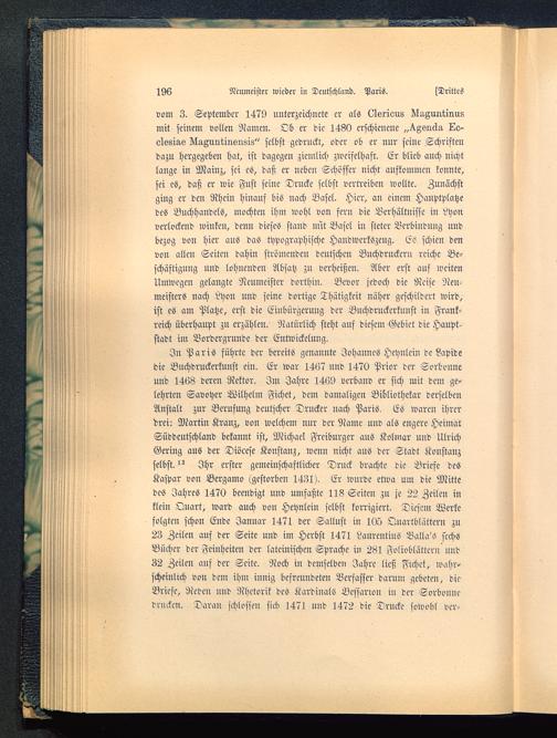 In Paris führte der bereits genannte Johannes Hcynlein de Lapiredie Buchdruckerkunst ein. Er war 1467 und 1470 Prior der Sorbonneund 1468 deren Rektor. Im Jahre 1469 verband er sich mit dem ge-lehrten Savoyer Wilhelm Fichet, dem damaligen Bibliothekar derselbenAnstalt zur Berufung deutscher Drucker nach Paris . Es waren ihrerdrei: Martin Kranz, von welchem nur der Name und als engere HeimatSüddeutschland bekannt ist, Michael Freiburgcr aus Kolmar und UlrichGering aus der Diöcese Konstanz, wenn nicht aus der Stadt Konstauzselbst." Ihr erster gemeinschaftlicher Druck brachte die Briefe desKaspar von Bergamo (gestorben 1431). Er wurde etwa um die Mittedes Jahres 1470 beendigt und umfaßte 118 Seiten zu je 2Z Zeilen inklein Quart, ward auch von Heynlein selbst korrigiert. Diesem Werkefolgten schon Ende Januar 1471 der Sallust in 105 Qnartblättern zu23 Zeilen auf der Seite und im Herbst 1471 Laureutiuö Valla's sechsBücher der Feinheiten der lateinischen Sprache in 281 Folioblättcrn und32 Zeilen auf der Seite. Noch in demselben Jahre ließ Fichet, wahr-scheinlich von dem ihm innig befreundeten Verfasser darum gebeten, dieBriefe, Reden nnd Rhetorik des Kardinals Bessanon in der Sorbonnedrucken. Daran schlössen sich I47l nnd l47S die Drucke sowohl ver-