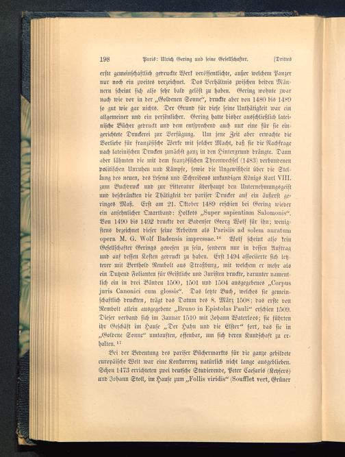 Bei der Bedeutung des pariser Büchermarkts für die ganze gebildeteeuropäische Welt war eine Konkurrenz natürlich nicht lange ausgeblieben.Schon 1473 errichteten zwei deutsche Studierende, Peter Caesaris (Kehscrö)und Johann Stoll, im Hause zum „?vlli8 virickis" (LouNst vsrt, Grüner