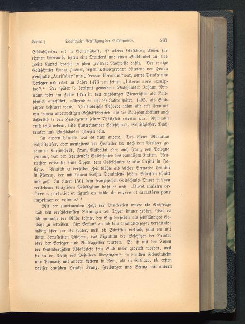 In andern Ländern war es nicht anders. Des Aldus MauntiusSchriftgießcr, oder wenigstens der Hersteller der nach dem Verleger ge-nannten Kursivschrift, Franz Raibolini oder auch Franz von Bolognagenannt, war der bedeutendste Goldschmied des damaligen Italien . Neu-mcistcr verdankte seine Typen dem Goldschmied Emilio Orsini in Fo-ligno. Ziemlich zu derselben Zeit blühte als solcher Bcrnardo Cenuiniin Florenz , der mit seinem Sohne Dominicus schöne Schriften schnittund goß. In einem 1561 dem französischen Goldschmied Duvet in Lyonverliehenen königlichen Privilegium heißt es Hoch „vuvst waistrs or-tsvrs g, ^oitr^iet et. tigurs 6n tg-KIs ckö eu^vrs et- o^rg-etörss pourimpriraer es vo^uros."^
