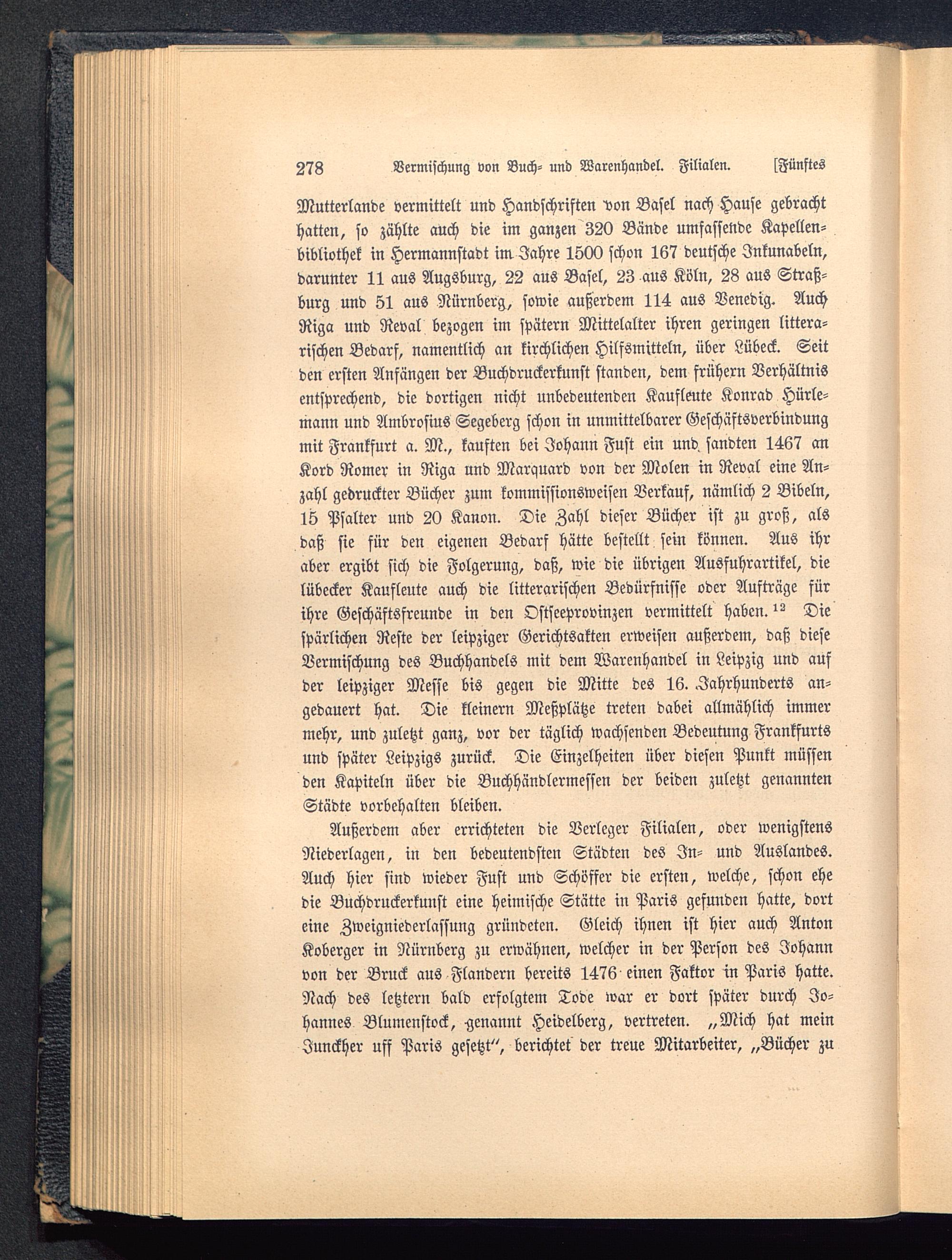 Mutterlande vermittelt und Handschriften Don Basel nach Hause gebrachthatten, so zählte auch die im ganzen 320 Bände umfassende Kapellen-bibliothek in Hermannstadt im Jahre 1500 schon 167 deutsche Inkunabeln,darunter 11 aus Augsburg, 22 aus Basel, 23 aus Köln, 28 aus Straß-burg und 51 aus Nürnberg , sowie außerdem 114 aus Venedig. AuchRiga und Reval bezogen im spätern Mittelalter ihren geringen littera-rischen Bedarf, namentlich an kirchlichen Hilfsmitteln, über Lübeck . Seitden ersten Anfängen der Buchdruckerkunst standen, dem frühern Verhältnisentsprechend, die dortigen nicht unbedeutenden Kaufleute Konrad Hürle-mann und Ambrosius Segeberg schon in unmittelbarer Geschäftsverbindungmit Frankfurt a. M, kauften bei Johann Fust ein und sandten 1467 cmKord Romer in Riga und Marquard von der Molen in Reval eine An-zahl gedruckter Bücher zum kommissionsweisen Verkauf, nämlich 2 Bibeln,15 Psalter und 20 Kanon. Die Zahl dieser Bücher ist zu groß, alsdaß sie für den eigenen Bedarf hätte bestellt sein können. Aus ihraber ergibt sich die Folgerung, daß, wie die übrigen Ausfuhrartikel, dielübecker Kaufleute auch die litterarischen Bedürfnisse oder Aufträge fürihre Geschäftsfreunde in den Ostseeprovinzen vermittelt haben." Diespärlichen Reste der leipziger Gerichtsakten erweisen außerdem, daß dieseVermischung des Buchhandels mit dem Warenhandel in Leipzig und aufder leipziger Messe bis gegen die Mitte des 16. .Jahrhunderts an-gedauert hat. Die kleinern Meßplätze treten dabei allmählich immermehr, und zuletzt ganz, vor der täglich wachsenden Bedeutung Frankfurts und später Leipzigs zurück. Die Einzelheiten über diesen Punkt müssenden Kapiteln über die Buchhändlermessen der beiden zuletzt genanntenStädte vorbehalten bleiben.