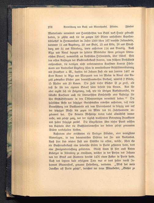Außerdem aber errichteten die Verleger Filialen, oder wenigstensNiederlagen, in den bedeutendsten Städten des In- und Auslandes.Auch hier sind wieder Fust und Schöffer die ersten, welche, schon ehedie Buchdruckerkunst eine heimische Stätte in Paris gefunden hatte, dorteine Zweigniederlassung gründeten. Gleich ihnen ist hier auch AntonKoberger in Nürnberg zu erwähnen, welcher in der Person des Johannvon der Brück aus Flandern bereits 1476 einen Faktor in Paris hatte.Nach des letztern bald erfolgtem Tode war er dort später durch Jo-hannes Blumenstock, genannt Heidelberg , vertreten. „Mich hat meinJunckher uff Paris gesetzt", berichtet der treue Mitarbeiter, „Bücher zu