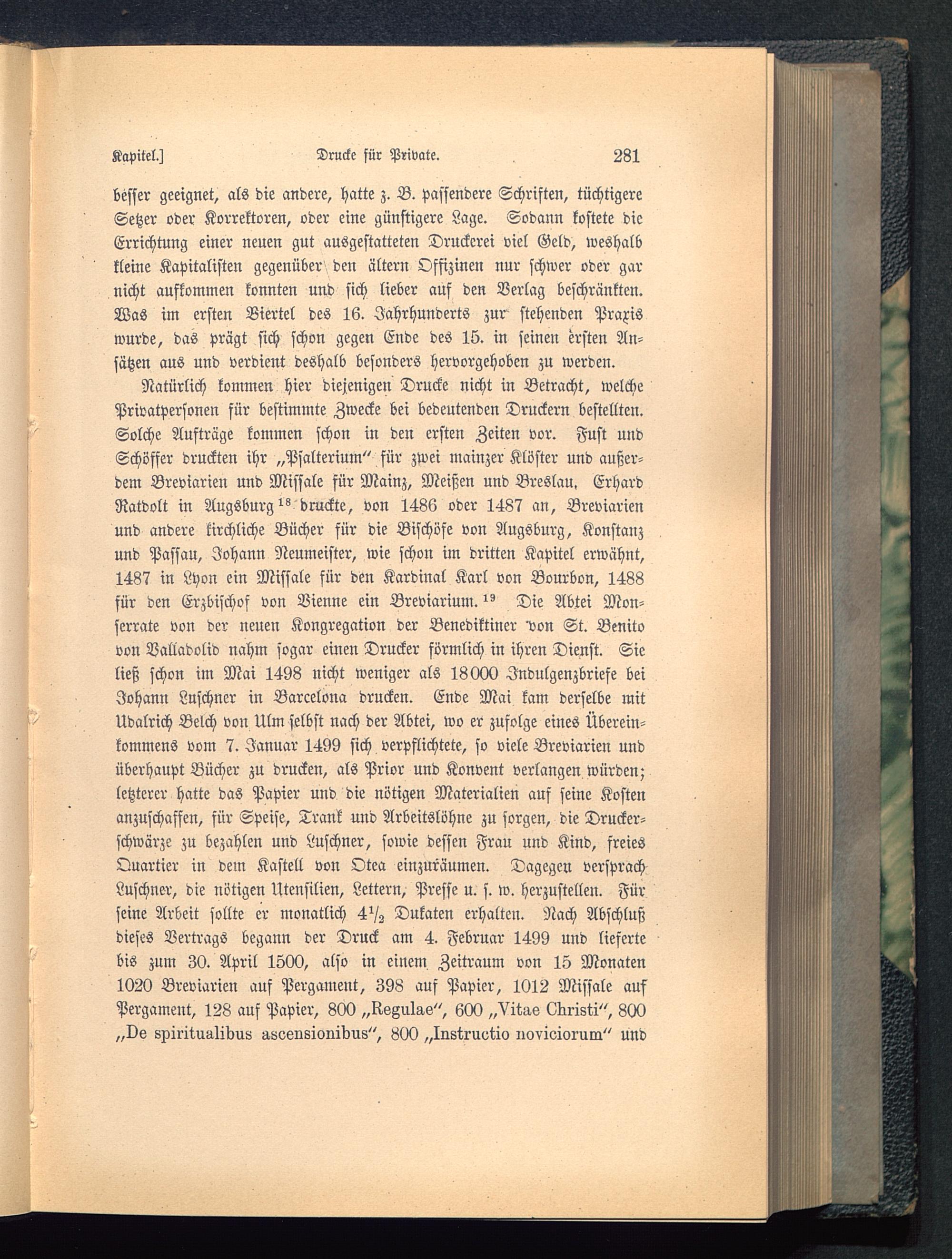 Natürlich kommen hier diejenigen Drucke nicht in Betracht, welchePrivatpersonen für bestimmte Zwecke bei bedeutenden Druckern bestellten.Solche Aufträge kommen schon in den ersten Zeiten vor. Fust undSchösfer druckten ihr „Psalterium" für zwei Mainzer Klöster und außer-dem Breviarien und Missale für Mainz, Meißen und Breslau. ErhardRatdolt in Augsburg " druckte, von 1486 oder 1487 an, Breviarienund andere kirchliche Bücher für die Bischöfe von Augsburg, Konstanz und Passau , Johann Neumeister, wie schon im dritten Kapitel erwähnt,1487 in Lyon ein Missale für den Kardinal Karl von Bourbon , 1488für den Erzbischof von Vienne ein Breviarium." Die Abtei Mon-serrate von der neuen Kongregation der Benediktiner 'von St. Benitovon Valladolid nahm sogar einen Drucker förmlich in ihren Dienst. Sieließ schon im Mai 1498 nicht weniger als 18000 Jndulgenzbriese beiJohann Luschner in Barcelona drucken. Ende Mai kam derselbe mitUdalrich Belch von Ulm selbst nach der Abtei, wo er zufolge eines Überein-kommens vom 7. Januar 1499 sich verpflichtete, so viele Breviarien undüberhaupt Bücher zu drucken, als Prior und Konvent verlangen würden;letzterer hatte das Papier und die nötigen Materialien auf seine Kostenanzuschaffen, für Speise, Trank und Arbeitslöhne zu sorgen, die Drucker-schwärze zu bezahlen und Luschner, sowie dessen Frau und Kind, freiesQuartier in dem Kastell von Otea einzuräumen. Dagegen versprachLuschner, die nötigen Utensilien, Lettern, Presse u. s. w. herzustellen. Fürseine Arbeit sollte er monatlich 4^/z Dukaten erhalten. Nach Abschlußdieses Vertrags begann der Druck am 4. Februar 1499 und liefertebis zum 30. April 1500, also in einem Zeitraum von 15 Monaten1020 Breviarien auf Pergameut, 398 auf Papier, 1012 Missale aufPergament, 128 auf Papier, 800 „Ksgulae", 600 „Vitu.6 LKristi", 800„ve spiritualibuL iZ-soellsioiiibus", ^00 „Instructio iiizvieioi-um" und