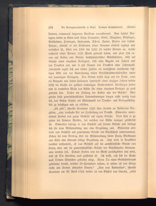 „Es gibt", schreibt Erasmus 1523 über Froben an Polidorus Ver-gilius, „ciue dreifache Art der Herstellung des Drucks. Bisweilen unter-nimmt Froben das ganze Geschäft auf eigene Gefahr. Dies thut er zuZeiten bei kleinern Werken, bei welchen das Risiko weniger gefährlichist. Bisweilen besorgt er das Geschäft auf fremde Gefahr und bedingtsich für seine Mühewaltung nur eine Vergütung aus. Bisweilen aberwird das Geschäft auf gemeinsame Gefahr der Gesellschaft unternommen.Schon bei dem Vertrag über die Mühewaltung bietet Franz Birckmann aus Köln eine überaus billige Bezahlung an. Jetzt wird in Frankfurt darüber verhandelt, ob das Geschäft auf die ausschließliche Gefahr vonFranz oder auf die gemeinschaftliche Gefahr der Gesellschafter übernom-men werden soll. Sobald Froben von der Messe zurückgekehrt sein wird,will ich Dir schreiben, was geschehen ist. Ich hoffe, daß sich die Sachenach Deinen Wünschen gestalten möge. Wenn Du einen Geschäftsfreundgewinnen kannst, welcher 50 Exemplare nähme, so würde ich das übrigeleicht mit Froben abmachen können." „Aus dem Ambrosius", schreibtErasmus am 30. April 1524 weiter an den Bischof von Lineoln, „wird