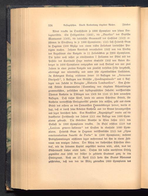 Aldus druckte im Durchschnitt je 1000 Exemplare von seinen Ver-lagsartikeln. Ein Heiligenleben (1502), die „Bucolica" des BaptistaMantuanus (1503), die lateinische Grammatik des Cochläus (1512) er-schienen in Straßburg in je 1000 Exemplaren; 1515 ließ Heinrich Gran in Hagenau 1500 Abzüge von einem dicken Folioband lateinischer Pre-digten machen. Johann Amerbach veranstaltete 1502 von den Werkendes Augustinus eine Ausgabe in 11 Foliobänden zu 2200 Exemplaren.Die später noch näher zu erwähnenden 7 Folianten der Bibel mit derPostille des Kardinals Hugo wurden ebenfalls 1502 von Anton Ko-berger in 1600 Exemplaren ausgegeben und nach Verlauf von nur zweiJahren in einer zweiten Ausgabe von ziemlich derselben Höhe hergestellt,allerdings nur widerwillig und unter sehr eigentümlichen Umständen.In Kobergers Verlag erschienen serner 10 Auflagen der „LerwonesVi8<zixuli", 5 Auflagen von Gritschs „HuaäragssilliÄls" und 6 Auf-lagen von Jakobs de Voragine „Liswrig. I^ombarcliLa". Von Hein-rich Bebels Kommentarien (Sammlung von einzelnen Abhandlungengrammatischen, politischen und lexikographischen Inhalts) veröffentlichteThomas Anshelm in Tübingen von 1503 bis 1516 13 stets vermehrteAuflagen. Daß dieses Werk, sowie die andern Schriften Bebels, fürAnshelm vortreffliche Verlagsartikel gewesen sein müssen, geht aus einemBriefe des erster» an den Humanisten ^ummelsberger hervor, worin ersagt, daß er durch seine Arbeiten Anshelm aus der Armut herausgerissenund sogar bereichert habe. Von Reuchlins „Augenspiegel" wurde auf diefrankfurter Herbstmesse des Jahres 1511 eine Auflage von 1000 Exem-plaren gebracht. Die Gebrüder Alantsee in Wien ließen 1511 denSallust in 1000 Exemplaren drucken. In Basel erschien 1518 das„I^exioori Ai-g-eov-latillum" des Craston in ebenfalls 1000 Exem-plaren. Heinrich Gran in Hagenau veröffentlichte 1515 das „Oxuseolloimiig.t<zriuiii Lg-notii äs ?ort,g." in 1500 Exemplaren; mehrerePredigtsammlungen erschienen sogar mehreremal bei ihm in einem Zeit-räum von wenigen Jahren. Der Absatz der Lutherschen Schriften über-traf, wie im siebenten Kapitel angeführt werden wird, alles, was derBüchermarkt bisher erlebt hatte. Diesem bis dahin unerhörten Erfolggegenüber.trat selbst der früher so gefeierte Erasmus ganz in denHintergrund. Noch am 1-7. April 1515 hatte ihm Beatus Rhenanus geschrieben, daß von den im März gedruckten 1800 Exemplaren des