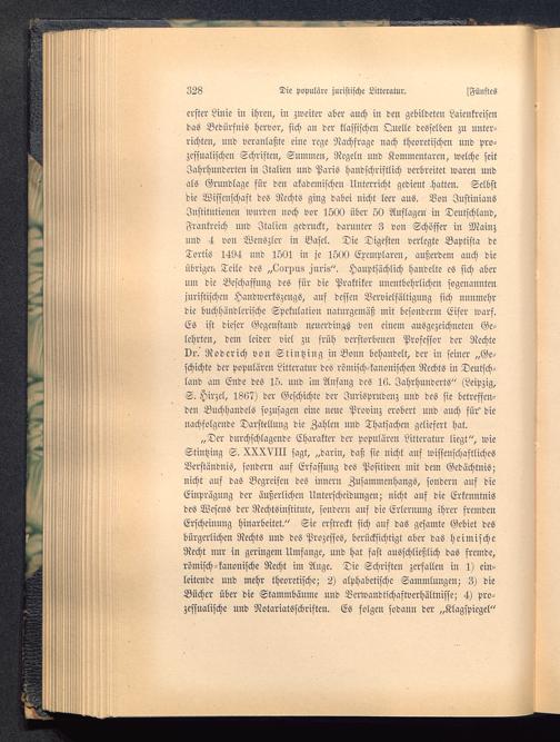 erster Linie in ihren, in zweiter aber auch in den gebildeten Laienkreisendas Bedürfnis hervor, sich an der klassischen Quelle desselben zu unter-richten, und veranlaßte eine rege Nachfrage nach theoretischen und pro-zcssualischen Schriften, Summen, Regeln und Kommentaren, welche seitJahrhunderten in Italien und Paris handschriftlich verbreitet waren undals Grundlage für den akademischen Unterricht gedient hatten. Selbstdie Wissenschaft des Rechts ging dabei nicht leer aus. Von Justinians Institutionen wurden noch vor 1500 über 50 Auflagen in Deutschland ,Frankreich und Italien gedruckt, darunter 3 von Schöffer in Mainz und 4 von Wcuszler in Basel . Die Digesten verlegte Baptista deTortis 1494 und 1501 in je 1500 Exemplaren, außerdem auch dieübrigen Teile des „Lorxus M-is". Hauptsächlich handelte es sich aberum die Beschaffung des für die Praktiker unentbehrlichen sogenanntenjuristischen Handwerkszeugs, auf dessen Vervielfältigung sich nunmehrdie buchhändlcrische Spekulation naturgemäß mit besondern: Eifer warf.Es ist dieser Gegenstand neuerdings von einem ausgezeichneten Ge-lehrten, dem leider viel zu früh verstorbenen Professor der RechteDr. Roderich von Stintzing in Bonn behandelt, der in seiner „Ge-schichte der populären Litteratur des römisch-kanonischen Rechts in Deutsch-land am Ende des 15. und im Anfang des 16. Jahrhunderts" (Leipzig ,S. Hirzel, 1867) der Geschichte der Jurisprudenz und des sie betreffen-den Buchhandels sozusagen eine neue Provinz erobert und auch für' dienachfolgende Darstellung die Zahlen und Thatsachen geliefert hat.