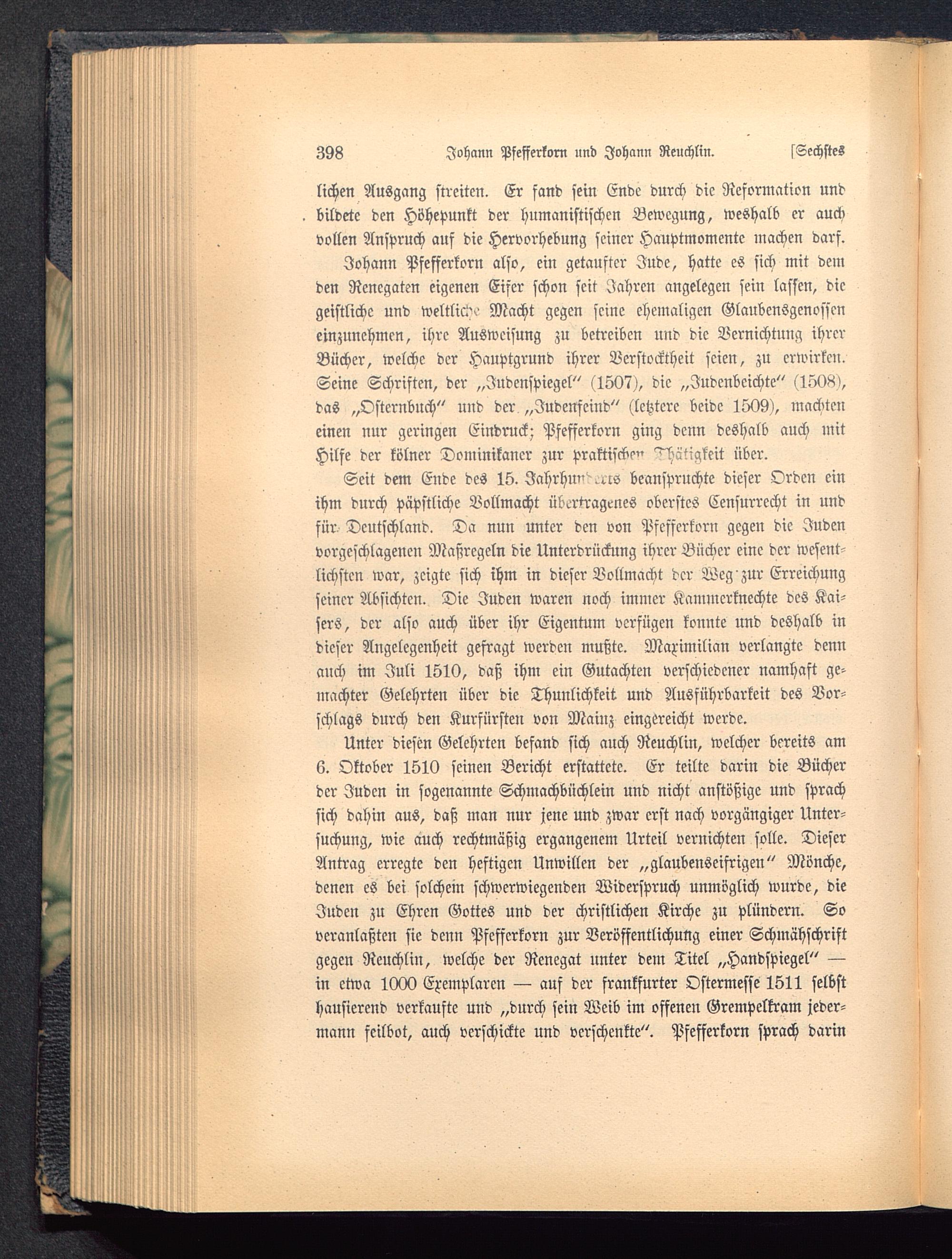 Seit dem Ende des 15. Jahrhw' ^cs beanspruchte dieser Orden einihm durch päpstliche Vollmacht übertragenes oberstes Censurrecht in undfür Deutschland . Da nun unter den von Pfefferkorn gegen die Judenvorgeschlagenen Maßregeln die Unterdrückung ihrer Bücher eine der Wesenslichstcn war, zeigte sich ihm in dieser Vollmacht der Weg zur Erreichungseiner Absichten. Die Juden waren noch immer Kammcrknechte des Kai-sers, der also auch über ihr Eigentum verfügen konnte und deshalb indieser Angelegenheit gefragt werden mußte. Maximilian verlangte dennauch im Juli 1510, daß ihm ein Gutachten verschiedener namhaft ge-machter Gelehrten über die Thunlichkeit. und Ausführbarkeit des Vor-schlags durch den Kurfürsten von Mainz eingereicht werde.