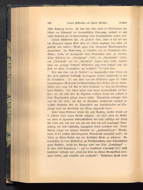 Johann Pfefferkorn also, ein getaufter Jude, hatte es sich mit demden Renegaten eigenen Eifer schon seit Iahren angelegen sein lassen, diegeistliche und weltlich Macht gegen seine ehemaligen Glaubensgenosseneinzunehmen, ihre Ausweisung zu betreiben und die Vernichtung ihrerBücher, welche der Hauptgrund ihrer Verstocktheit seien, zu erwirken.Seine Schriften, der „Judenspiegel" (1507), die „Judcnbeichte" (1508),das „Osternbuch" und der „Judenfeind" (letztere beide 1509), machteneinen nur geringen Eindruck; Pfefferkorn ging denn deshalb auch mitHilfe der kölner Dominikaner zur praktische" Tätigkeit über.