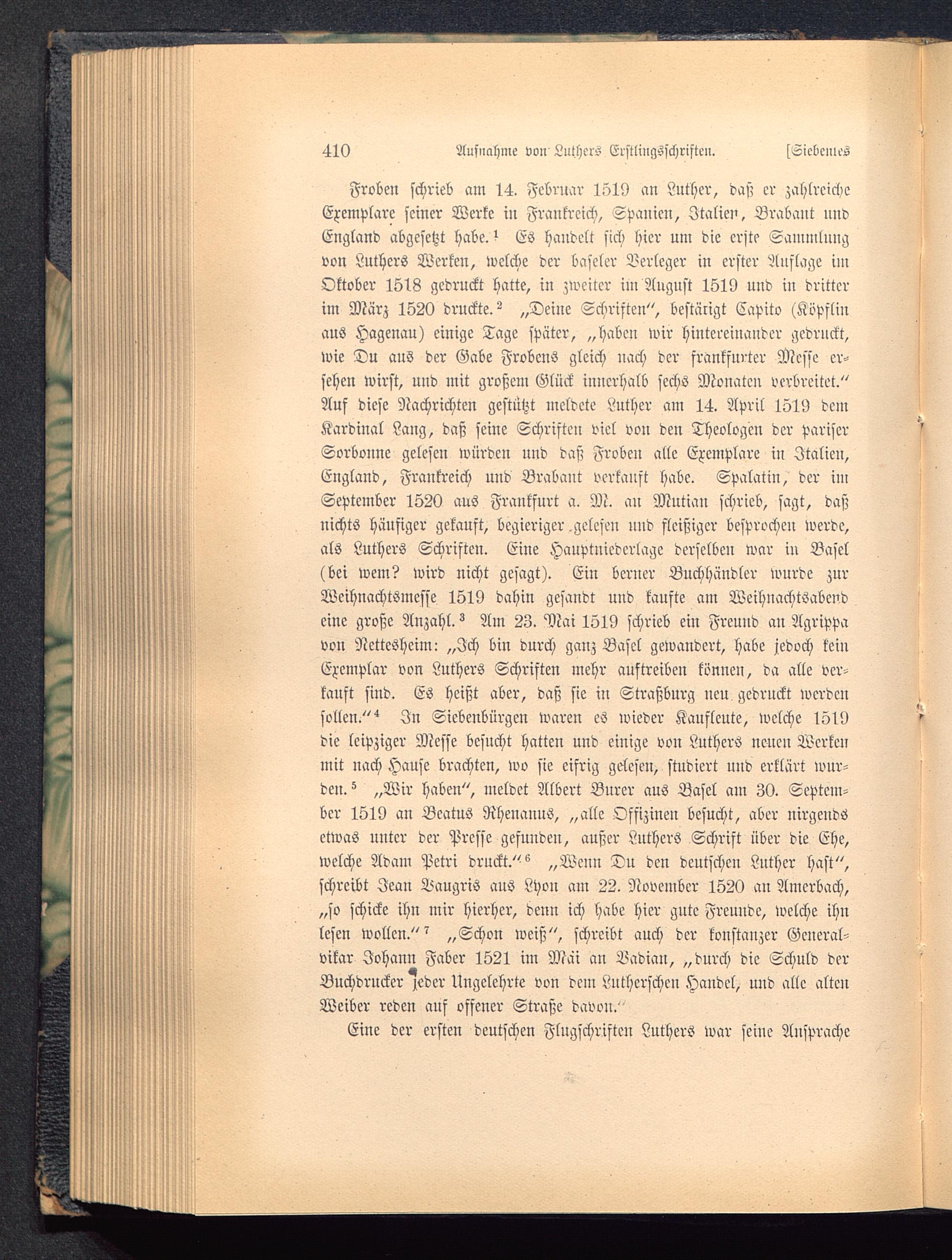 Froben schrieb am 14. Februar 1519 an Luther, daß er zahlreicheExemplare seiner Werke in Frankreich, Spanien, Italien , Trabant undEngland abgesetzt habe. ^ Es handelt sich hier um die erste Sammlungvon Luthers Werken, welche der bascler Verleger in erster Auflage imOktober 1518 gedruckt hatte, in zweiler im August 1519 und in dritterim März 1520 druckte. ^ „Deine Schriften", bestätigt Capito (Köpflinaus Hagenan) einige Tage später, „haben wir hintereiuaudcr gedruckt,wie Du aus der Gabe Frobens gleich uach der frankfurter Messe er-sehen wirst, und mit großem Glück innerhalb sechs Monaten verbreitet."Auf diese Nachrichten gestutzt meldete Luther am 14. April 1519 deinKardinal Lang, daß seine Schriften viel von den Theologen der pariserSorbonne gelesen würden und daß Froben alte Exemplare in Italien ,England, Frankreich und Brabant verkauft habe. Spalatin, der imSeptember 1520 aus Frankfurt a. M. au Mutian schrieb, sagt, daßnichts häusiger gekauft, begieriger.gelesen uud fleißiger besprochen werde,als Luthers Schriften. Eine Hauptuicdcrlage derselben war in Basel (bei wem? wird nicht gesagt). Ein bcrner Buchhändler wurde zurWcihuachtSmesse 1519 dahin gesandt und kaufte am Weihnachtsabendeine große Anzahl. ^ Am 23. Mai 1519 schrieb ein Freund an Agrippa von Nettcsheim: „Ich bin durch ganz Basel gewandert, habe jedoch keinExemplar von Luthers Schriften mehr auftreiben können, da alle ver-kauft sind. Es heißt aber, daß sie in Straßburg neu gedruckt werdensollen." 4 In Siebenbürgen waren eS wieder Kaufleute, welche 1519die leipziger Messe besucht hatten und einige von Luthers neuen Werkenmit nach Hanse brachten, wo sie eifrig gelesen, studiert uud erklärt wur-de». ^ „Wir haben", meldet Albert Burer aus Basel am 30. Septem-ber 1519 an Bcatus Rhenanus, „alle Offizinen besucht, aber uirgeudsetwas uuter der Presse gefunden, außer Luthers Schrift über die Ehe,welche Adam Petri druckt/^ „Wenn Du den deutschen Lnther hast",schreibt Jean Vaugris aus Lyon am 22. November 1520 an Amcrbach,„so schicke ihn mir hierher, denn ich habe hier gute Freunde, welche ihnlesen wollen." ? „Schon weiß", schreibt auch der konstanzer General-Vikar Johann Faber 1521 im Mai an Vadian , „durch die Schuld derBuchdrucker ^cder Ungelehrte von dem Luthcrscheu Handel, und alle altenWeiber reden auf offener Straße davon/
