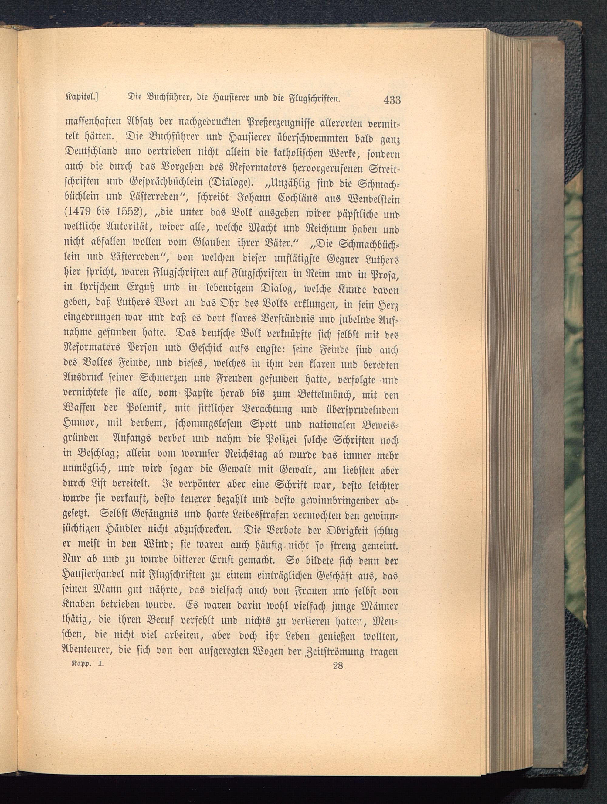 massenhaften Absatz der nachgedruckten Preßerzeugnisse allerorten vermit-telt hätten. Die Buchführer und Hausierer überschwemmten bald ganzDeutschland und vertrieben nicht allein die katholischen Werke, sondernauch die durch das Vorgehe« des Reformators hervorgerufenen Streit-schriften und Gcsprächbüchlein (Dialoge). „Unzählig sind die Schmach-büchlein und Lästerreden", schreibt Johann Cochläus aus Wendelstein (1479 bis 1552), „die unter das Volk ausgehen wider päpstliche undweltliche Autorität, wider alle, welche Macht und Reichtum haben undnicht abfallen wollen vom Glauben ihrer Väter." „Die Schmachbüch-lein und Lästerreden", von welchen dieser unflätigste Gegner Luthers hier spricht, waren Flugschriften auf Flugschriften in Reim und in Prosa,in lyrischem Erguß und in lebendigem Dialog, welche Kunde davongeben, daß Luthers Wort an das Ohr des Volks erklungen, in sein Herzeingedrungen war und daß es dort klares Verständnis und jubelnde Auf-nahme gefunden hatte. Das deutsche Volk verknüpfte sich selbst mit desReformators Person und Geschick aufs engste: seine Feinde sind auchdes Volkes Feinde, und dieses, welches in ihm den klaren und beredtenAusdruck seiner Schmerzen und Freuden gefunden hatte, verfolgte undvernichtete sie alle, vom Papste herab bis zum Bettelmönch, mit denWaffen der Polemik, mit sittlicher Verachtung und übersprudelndemHumor, mit derbem, schonungslosem Spott und nationalen Beweis-gründen Anfangs verbot und nahm die Polizei solche Schriften nochin Beschlag; allein vom wormser Reichstag ab wurde das immer mehrunmöglich, und wird sogar die Gewalt mit Gewalt, am liebsten aberdurch List vereitelt. Je verpönter aber eine Schrift war, desto leichterwurde sie verkauft, desto teuerer bezahlt und desto gewinnbringender ab-gesetzt. Selbst Gefängnis und harte Leibesstrafen vermochten den gewinn-süchtigen Händler nicht abzuschrecken. Die Verbote der Obrigkeit schluger meist in den Wind; sie waren auch häufig nicht so streng gemeint.Nur ab und zu wurde bitterer Ernst gemacht. So bildete sich denn derHausierhandel mit Flugschriften zu einem einträglichen Geschäft aus, dasseinen Mann gnt nährte, das vielfach auch von Frauen und selbst vonKnaben betrieben wurde. Es waren darin Wohl vielfach junge Männerthätig, die ihren Beruf verfehlt und nichts zu verlieren hatten, Men-schen, die nicht viel arbeiten, aber doch ihr Leben genießen wollten,Abenteurer, die sich von den aufgeregten Wogen der Zeitströmung tragenKapp. i. 28