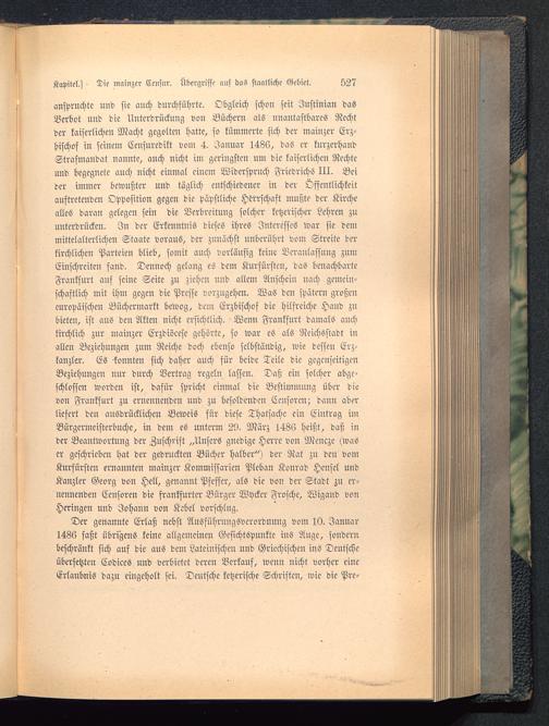 anspruchte und sie auch durchführte. Obgleich schon seit Justinian dasVerbot und die Unterdrückung von Büchern als unantastbares Rechtder kaiserlichen Macht gegolten hatte, so kümmerte sich der Mainzer Crz-bischof in seinem Censuredikt vom 4. Januar 1486, das er kurzerhandStrafmandat nannte, auch nicht im geringsten um die kaiserlichen Rechteund begegnete auch nicht einmal einem Widerspruch Friedrichs III. Beider immer bewußter und täglich entschiedener in der Öffentlichkeitauftretenden Opposition gegen die päpstliche Herrschaft mußte der Kirchealles darau gelegen sein die Verbreitung solcher ketzerischer Lehren zuunterdrücken. In der Erkenntnis dieses ihres Interesses war sie demmittelalterlichen Staate voraus, der zunächst unberührt vom Streite derkirchlichen Parteien blieb, somit auch vorläufig keine Veranlassung zumEinschreiten fand. Dennoch gelang es dem Kurfürsten, das benachbarteFrankfurt auf seine Seite zu ziehen und allem Anschein nach gemein-schaftlich mit ihm gegen die Presse vorzugehen. Was den spätern großeneuropäischen Büchermarkt bewog, dem Erzbischof die hilfreiche Hand znbieten, ist aus den Akten nicht ersichtlich. Wenn Frankfurt damals auchkirchlich zur Mainzer Erzdiöcesc gehörte, so war es als Reichsstadt inallen Beziehungen zum Reiche doch ebenso selbständig, wie dessen Erz-kanzler. Es konnten sich daher auch für beide Teile die gegenseitigenBeziehungen nur durch Vertrag regeln lassen. Daß ein solcher abge-schlossen worden ist, dafür spricht einmal die Bestimmnng über dievon Frankfurt zu ernennenden und zu besoldenden Censoren; dann aberliefert den ausdrücklichen Beweis für diese Thatsache ein Eintrag imBürgermcisterbuchc, in dem es unterm 29. März 1.486 heißt, daß inder Beantwortung der Zuschrift „Unsers gnedige Hcrre von Mencze «waser geschrieben hat der gedruckten Bücher halber") der Rat zu den vomKurfürsten ernannten Mainzer Kommissarien Pleban Konrad Henscl undKanzler Georg von Hell, genannt Pfeffer, als die von der Stadt zu er-nennenden Censoren die frankfurter Bürger Wyckcr Frosche, Wigaud vonHeringen und Johann von Kebel vorschlug.