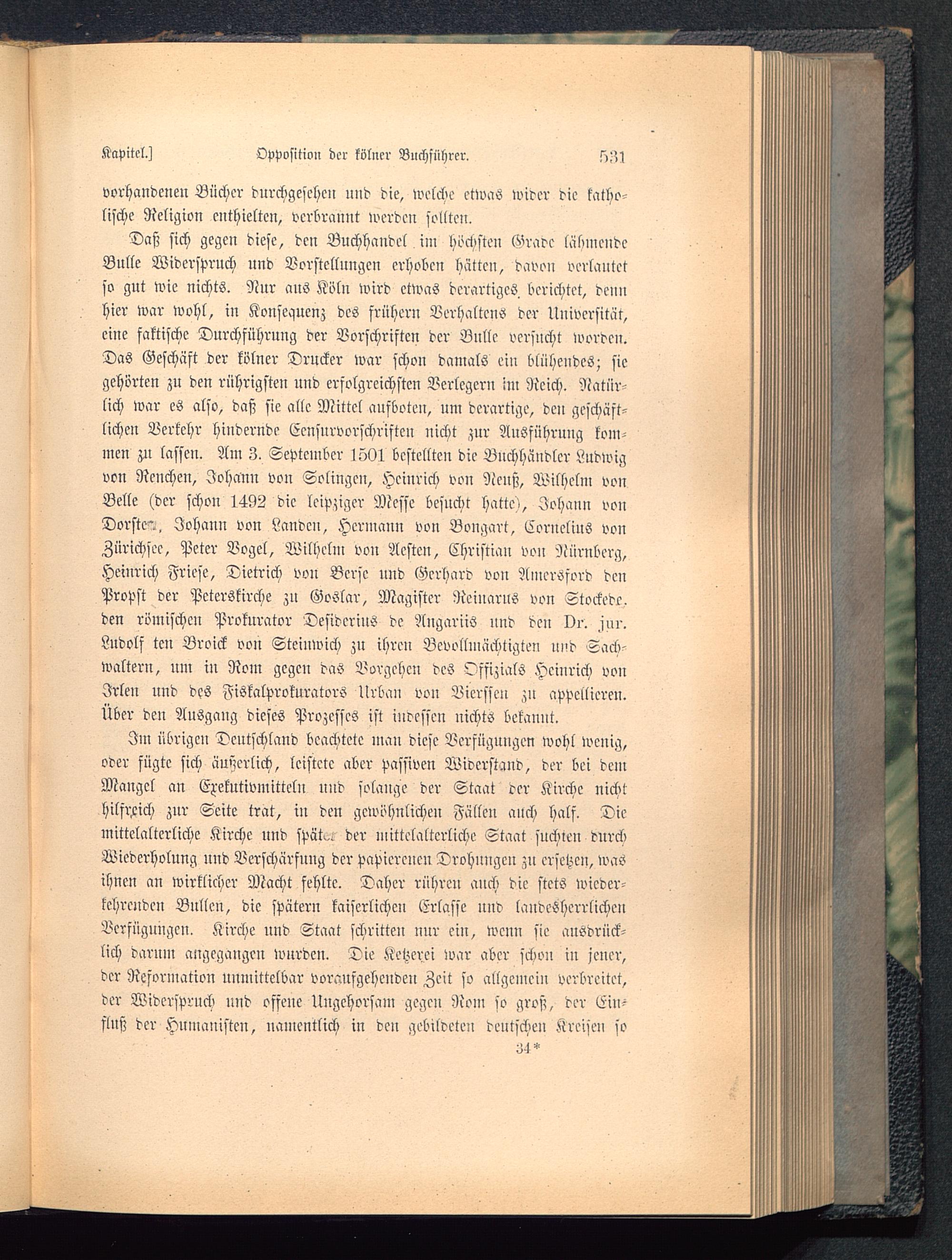 Daß sich gegen diese, den Buchhandel im höchsten Grade lalnncndeBulle Widerspruch und Vorstellungen erhoben hätten, davon verlautetso gut wie nichts. Nur aus Kölu wird etwas derartiges berichtet, dennhier war wohl, in Konsequenz des frühern Verhaltens der Universität,eine faktische Durchführung der Vorschriften der Bulle versucht worden.Das Geschäft der kölner Drucker war schon damals ein blühendes; siegehörten zu den rührigsten uud erfolgreichsten Verlegern im Reich. Ratürlieh war es also, daß sie alle Mittel anfboten, um derartige, dcu geschäft-liehen Verkehr hindernde Ecnsurvorschriftcu nicht zur Ausführung kom-men zu lassen. Am Z. September 1501 bestellten die Buchhändler Ludwigvon Ncnchen, Johann von Solingen, Heinrich von Nenß, Wilhelm vonBelle (der schon 1492 die leipziger Messe besucht hatte,, Johann vonDorste"., Johann von Landen, Hermann von Bongart, Cornelius vonZürichsee, Peter Vogel, Wilhelm von Acsten, Christian von Nürnberg,Heinrich Friese , Dietrich von Bersc und Gerhard von Amersford denPropst der Peterskirche zn Goslar , Magister Rcinarus von Stockede.den römischen Prokurator DesidcriuS de Augariiö und den Dr. für.Ludolf tcn Broick von Steinwich zu ihren Bevollmächtigten und Sach-waltern, um in Rom gegeu das Vorgehen dcö Offizialö Heinrich vonJrlen und des Fiskalprokurators Urbau von Vicrsscn zn appellieren.Über deu Ausgaug dieses Prozesses ist indessen nichts bekannt.