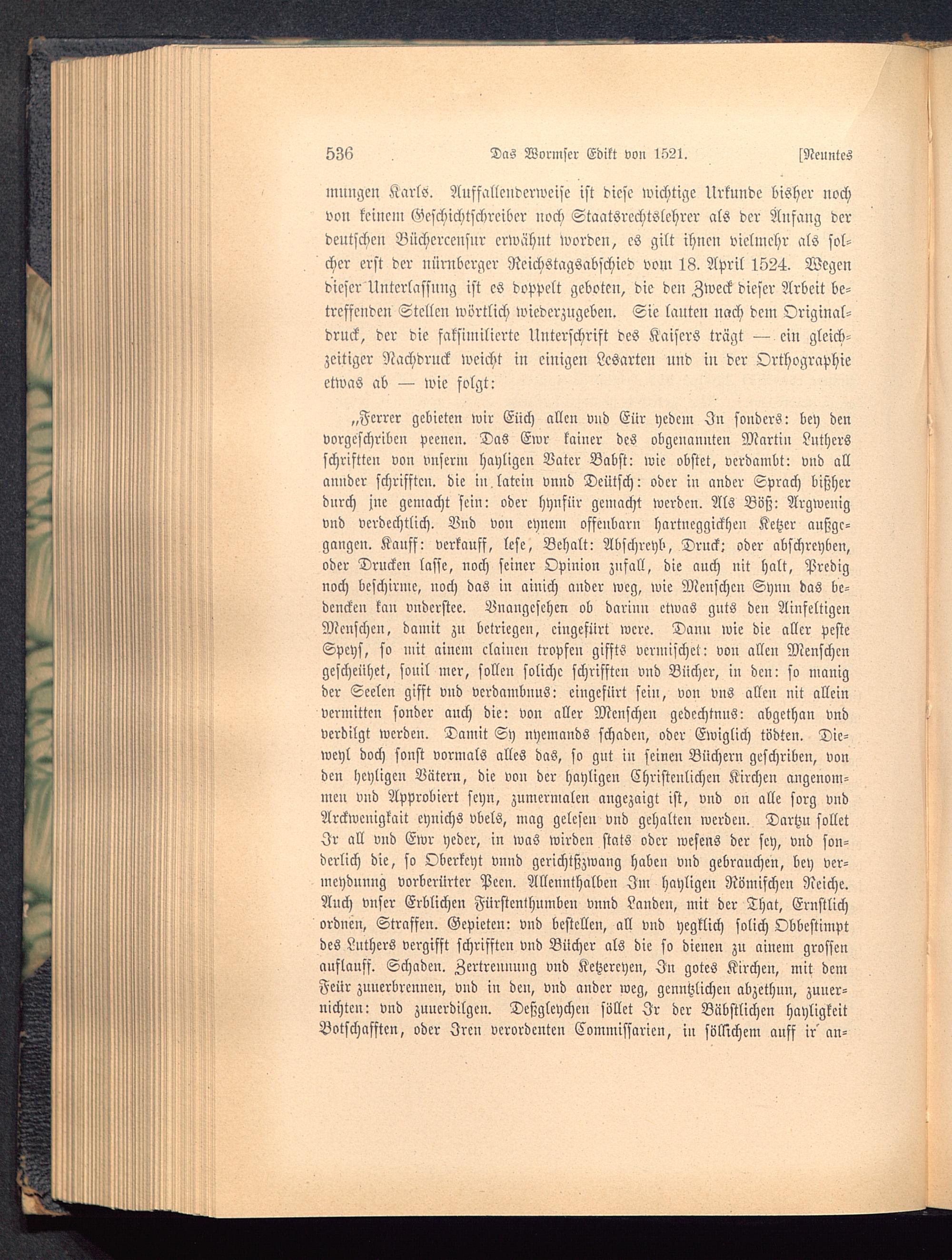 „Fcrrer gebieten wir Euch allen vnd Eiir ycdcm Zu sonders: bey denvorgcschribcn peencn. Das Ewr kainer des obgeuannten Martin Luthers schrifttcn von vnserm hayligcn Vater Babst: wie obstet, vcrdambt: vnd allanndcr schrifftcn. die iu latcin vnnd Deutsch : oder in ander Sprach bischerdnrch jne gemacht sein: oder hyufttr gemacht werden. Als Boß: Argwenigvnd verdcchtlich. Vnd von eyncm offenbarn hartncggickhen Ketzer anßgc-gangen. Kaufs: Verkaufs, lese, Behalt: Abschrcyb, Druck: oder abschreyben,oder Drucken lasse, noch seiner Ovinion znfall, die auch nit halt, Predignoch beschirme, noch das in ainich ander weg, wie Menschen Synn das be-dcncken kan vndcrstee. Vnangcsehcn ob darinu etwas gnts den AinfeltigenMenschen, damit zu bekriegen, cingefürt wcre. Dann wie die aller pcsteSpcys, so mit aincm claincn tropfen giffts vermischet: von allen Menschengescheühet, sonil mer, sollen solichc schrifften vnd Bücher, iu den: so manigder Seelen gisft vnd vcrdambnus: cingefürt sein, von vns allen nit alleinvermittcn sonder auch die: von aller Menschen gedcchtnns: abgethan vndverdilgt werden. Damit Sy nyemands schaden, oder Ewiglich todten. Dic-wcyl doch sonst vormals alles das, so gut iu seineu Büchern geschriben, vonden heyligcn Vätern, die von der hayligcn Christenlichen Kirchen angenom-men vud Approbiert seyn, zumermalcn angezaigt ist, vnd on alle sorg vndArckwcnigkait eynichs vbels, mag gelesen vnd gehalten werden. Dartzu solletJr all vud Ewr yeder, in was wirden stats oder wesens der sey, vnd son-derlich die, so Oberkeyt vnnd gcrichtßzwang haben vud gebrauchen, bey ver-mcyduuug vorberürter Pcen. Allennthalben Im hayligcn Römischen Reiche.Auch vnser Erblichen Fürstenthumbe» vnnd Landen, mit der That, Ernstlichordnen, Straffen. Gepieten: vnd bestellen, all vnd yegtlich solich Obbestimptdes Luthers vergifft schrifften vnd Bücher als die so dienen zu aiuem grossenauflauff. Schaden. Zertrennnng vnd Ketzcrcyen, Iu gotes Kirchen, mit demFcür zunerbrennen, vnd in den, vnd ander weg, gcnntzlichen abzcthnn, zuuer-nichtcn: vnd zuuerdilgen. Deßgleychen füllet Jr der Bäbstlichen hayligkcitBotschafftcn, oder Iren vcrordcnten Commissarieu, in söllichem anff ir' an-