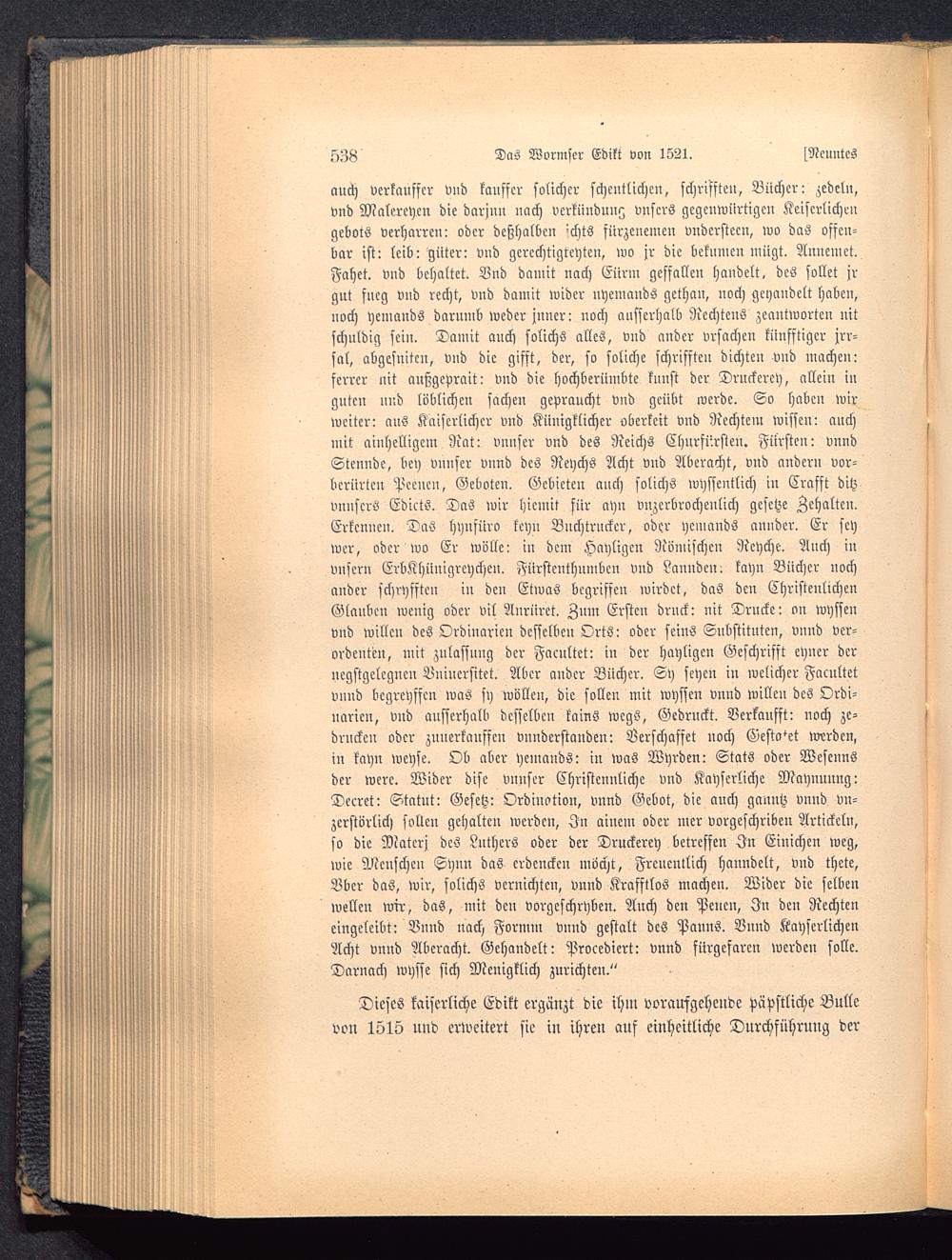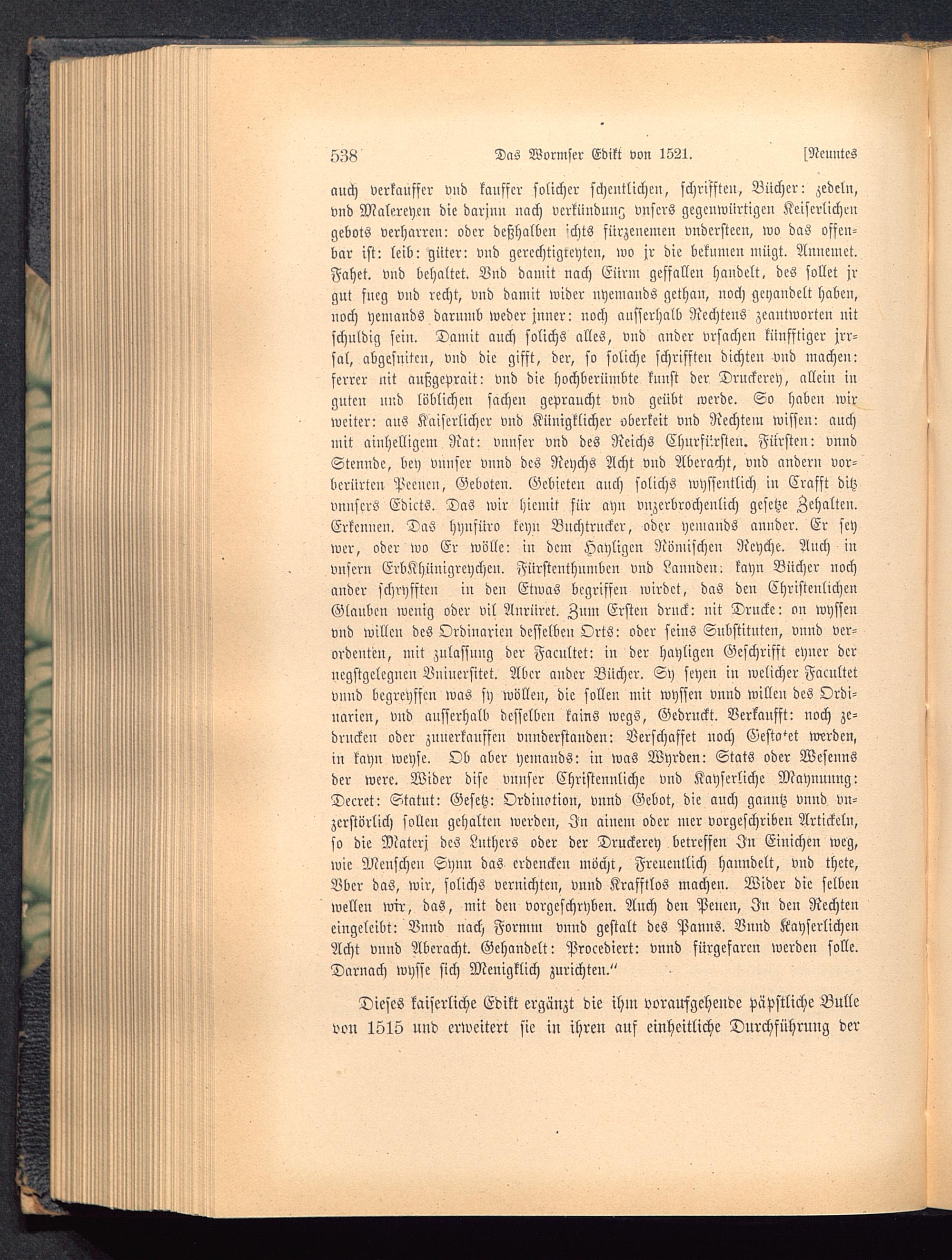 auch verkauffcr und kanffcr solichcr schcntlichcn, schrifften, Bücher: zedcln,vnd Malereyen die darjnn nach vcrkünduu^ vnscrs gegcnwürtigen Keiscrlichengebots verharren: oder deßhalben 'chts fürzenemen vnderstecn, wo das offen-bar ist: leib: giiter: vnd gercchtigteytcn, wo jr die bekumcn mügt. Aimemct.Fahet. vnd behaltet. Vnd damit nach Eürm geffallen handelt, des sollet jrgut fneg vnd recht, vnd damit wider nyemands gethan, noch gehandelt haben,noch yenmnds darnmb weder jnner: noch ansserhalb Rechtens zeantwortcn nitschuldig sein. Damit auch solichs alles, vnd ander vrsachen künfftigcr jrr-sal, abgesuitcu, vnd die gifft, der, so soliche schrifften dichten vnd machen:fcrrer nit außgeprait: vnd die hochberiimbtc kunst der Druckercy, alleiu iuguten und löblichen fachen gevraucht vnd geübt werde. So haben wirweiter: aus Kaiserlicher vnd Künigklichcr oberkeit vnd Rechtem wisseu: auchmit aiuhclligcm Nnt: vnnser vnd des Reichs Churfürsten. Fürsten : vnndStenudc, bey vnnser vnnd des Neychs Acht vnd Aberacht, vnd ander» vor-bcriirtcn Pccncn, Geboten. Gebieten anch solichs wyssentlich in Crafft ditzvnnscrö EdictS. Das wir hicmit für ahn vnzerbrochenlich gcsctze gehalten.Erkennen. DaS hynfüro tcy» Bnchtruckcr, oder ycmauds anuder. Er seywer, oder wo Er wolle: in dem Hayligcn Römischen Rcyche. Auch invnscrn ErbKhiinigrcychen. Fürstcnthnmbcn vnd Lanndein tayn Bücher nochander schryfften in den Etwas begriffen wirdct, daS den ChristcnlichenGlaube» wcuig oder vil Aurüret. Zum Ersten drnck: nit Drucke: on wyssenvnd Wille» des Ordinarien desselben Orts: oder seins Substitntcn, vnnd ver-ordcntcn, mit zulassuug der Facultct: iu der hayligcn Gcschrifft eyncr derncgstgclcgncn Buincrsitet. Aber a»dcr Bücher. Sy seye» i» welicher Facultetv»»d begreyffcn was sy wollen, die sollen mit wysse» vn»d willc» des Ordi-narien, vnd ausserhalb desselben tains Wegs, Gedruckt. Verkaufst: noch zc-druckeu oder znncrkanffcn vnnderstanden: Verschaffet noch Gestalt werden,i» kayn weyse. Ob aber ycmands: in waS Wyrden: Stats oder Wesennsder werc. Wider disc vnnser Christcnnlichc vnd Kayserliche Maynunng:Decrct: Statut: Gesetz: Orduwtivn, v»nd Gebot, die a»ch gau»tz vnnd v»-zcrstörlich sollen gehalten werden, In ainem oder mer vorgeschriben Artickcln,so die Materj des Luthers oder der Druckerey betreffen In Einichen weg,wie Menschen Synn das crdenckcn möcht, Frc»c»!lich ha»»dclt, v»d thete,Vbcr das, wir, solichs vernichte», vnnd Krafftlos machen. Wider die selbenwellen wir, das, mit den vorgeschoben. Anch den Pencn, In den Rechtencingelcibt: Vnnd nach Fornn» v»nd gestalt des Panns. Bund KayscrlichenAcht vnnd Aberacht. Gehandelt: Procediert: vnnd fürgefarcn werden solle.Darnach wysse sich Mcnigklich zurichten."