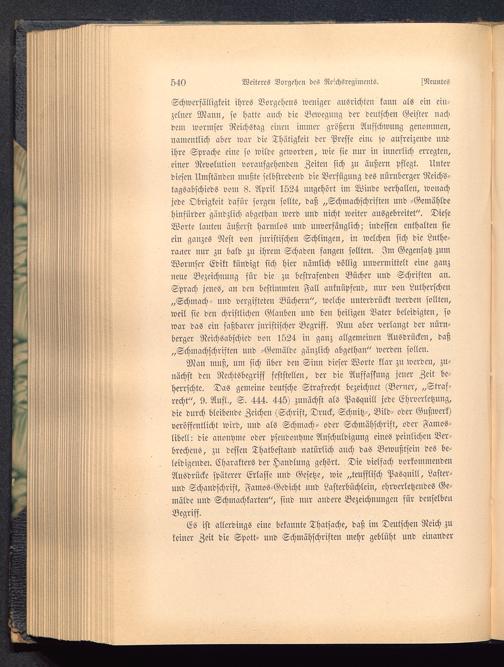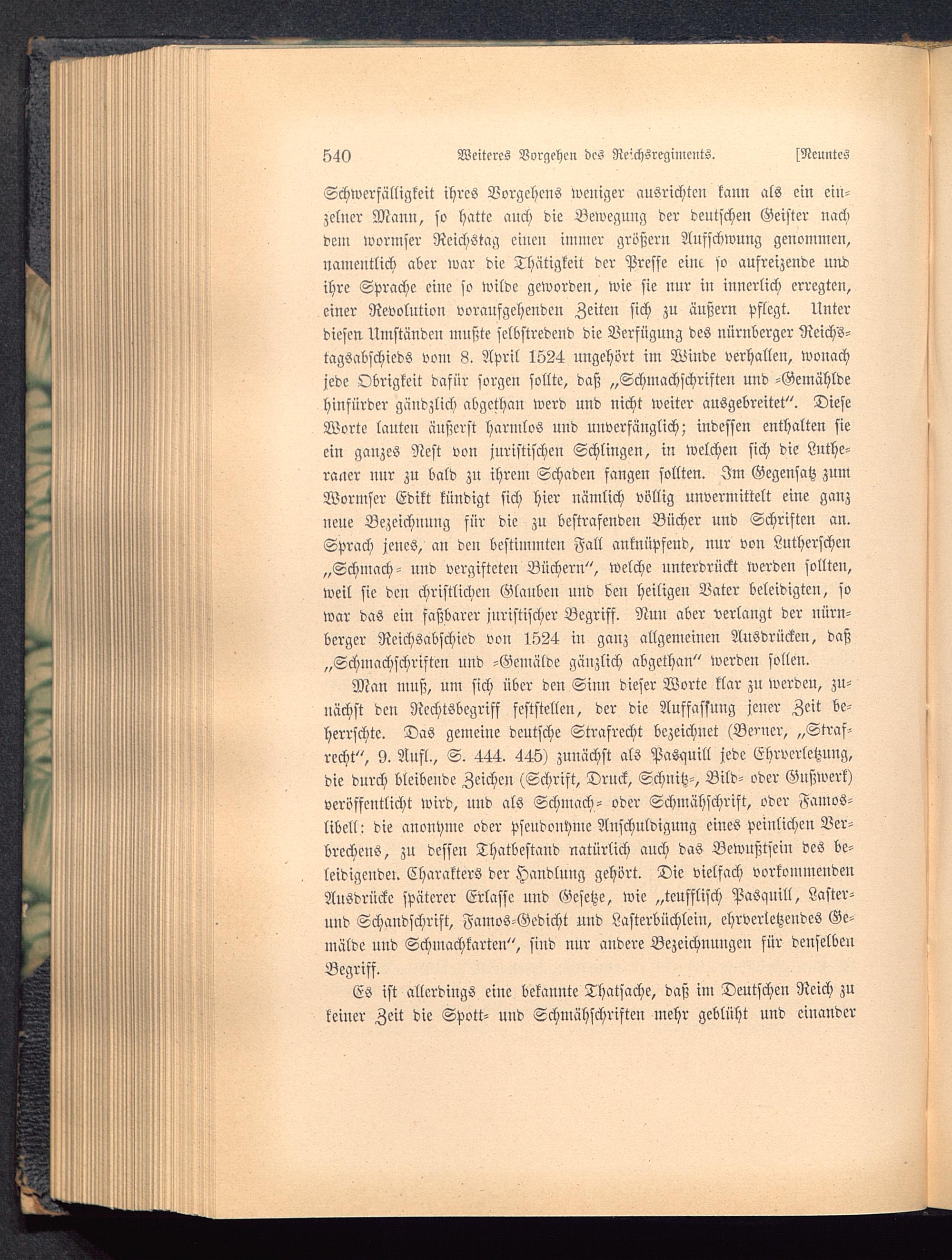 Schwerfälligkeit ihres Vorgehens weiliger ausrichten kann als ein ein-zelner Mann, so hatte auch die Bewegung der deutschen Geister nachdein wormser Reichstag eiucu immer größern Aufschwung genommen,namentlich aber war die Thätigkeit der Presse eine so aufreizende undihre Sprache eine so wilde geworden, wie sie nur in innerlich erregten,einer Revolution voraufgehenden Zeiten sich zu äußern Pflegt. Unterdiesen Umständcu mußte selbstredend die Verfügung des nürnberger Reichs-tagsabschieds vom 8. April 1524 ungehört im Winde verhallen, wonachjede Obrigkeit dafür sorgen sollte, daß „Schmachschriften und -Gemähldehinfürder gändzlich abgethan werd und nicht weiter ausgebreitet". DieseWorte lauteu äußerst harmlos uud unverfänglich; indessen enthalten sieein ganzes Nest von juristischen Schlingen, in welchen sich die Luthe-raner nur zu bald zu ihrem Schaden fangen sollten. Im Gegensatz zumWormser Edikt kündigt sich hier nämlich völlig unvermittelt eine ganzneue Bezeichnung für die zu bestrafenden Bücher und Schriften an.Sprach jenes, an den bestimmten Fall anknüpfend, nur von Lutherschen„Schmach- und vergifteten Büchern", welche unterdrückt werden sollten,weil sie den christlichen Glauben und den heiligen Vater beleidigten, sowar das ein faßbarer juristischer Begriff. Nun aber verlangt der nürn-berger Reichsabschicd von 1524 in ganz allgemeinen Ausdrücken, daß„Schmachschriften und -Gemälde gänzlich abgethan" werden sollen.
