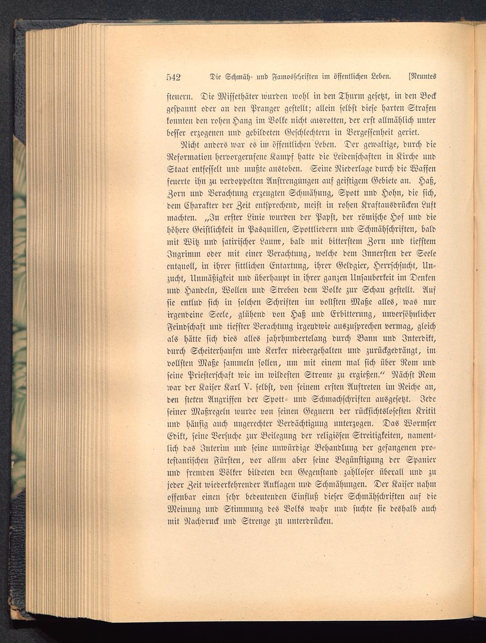 Nicht anders war es im öffentlichen Leben. Der gewaltige, dnrch dieReformation hervorgerufene Kampf hatte die Leidenschaften in Kirche undStaat entfesselt und mußte austoben. Seine Niederlage durch die Waffenfeuerte ihn zu verdoppelte» Anstrengungen ans geistigem Gebiete an. Haß,Zorn und Verachtung erzeugten Schmähung, Spott und Hohn, die sich,dem Charakter der Zeit entsprechend, meist in rohen Kraftausdrücken Luftmachten. „In erster Linie wurden der Papst, der römische Hof und diehöhere Geistlichkeit in Pasquillen, Spottlicdcrn und Schmähschriften, baldmit Witz und satirischer Lann?, bald mit bitterstem Zorn und tiefstemIngrimm oder mit einer Verachtung, welche dem Innersten der Seeleentquoll, in ihrer sittlichen Entartung, ihrer Geldgier, Herrschsucht, Un-zucht, Unmäßigkcit und überhaupt in ihrer ganzen Unsauberkeit im Denkenund Handeln, Wollen und Streben dein Volke zur Schau gestellt. Aufsie entlud sich in solchen Schriften im vollsten Maße alles, was nurirgendeine Seele, glühend von Haß und Erbitterung, unversöhnlicherFeindschaft und tiefster Verachtung irgendwie auszusprcchcn vermag, gleichals hätte sich dies alles jahrhundertelang durch Baun und Interdikt,durch Scheiterhaufen und Kerker niedergehalten und zurückgedrängt, imvollsten Maße sammeln sollen, um mit einein mal sich über Rom undseine Priestcrschaft wie im wildesten Strome zu ergießen." Nächst Romwar der Kaiser Karl V. selbst, von seinem ersten Auftreten im Reiche an,den steten Angriffen der Spott- und Schinachschriften ausgesetzt. Jedeseiner Maßregeln wurde von seinen Gegnern der rücksichtslosesten Krititund häufig auch ungerechter Verdächtigung unterzogen. Das WormscrEdikt, seiuc Versuche zur Beileguug der religiösen Streitigkeiten, nament-lich das Interim und seine unwürdige Behandlung der gefangenen pro-testantischen Fürsten, vor allem aber seine Begünstigung der Spanierund fremden Völker bildeten den Gegenstand zahlloser überall und zujeder Zeit wiederkehrender Anklagen und Schmähungen. Der Kaiser nahmoffenbar einen sehr bedeutenden Einflnß dieser Schmähschriften auf dieMeiuung und Stimmung des Volks wahr und suchte sie deshalb auchmit Nachdruck und Strenge zu unterdrücken.