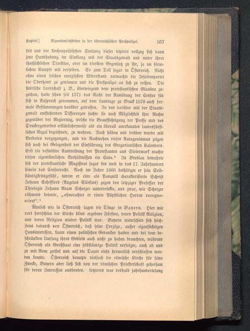 keit und der kirchenpolitischen Stellung dieser letzlern vollzog sich dannjene Handhabung im Einklang mit der Staatsgewalt und unter ihrerthatsächlichen Direktive, oder im direkten Gegensatz zu ihr, ja im förm-lichen Kampfe mit derselben. So zum Teil sogar in Österreich . Nichtohne einen solchen energischen Widerstand vermochte die Jesuitenparteidie Oberhand zu gewinnen und die Preßpolizei an sich zu reißen. Diesteirische Landschaft z. B., überwiegend dem protestantischen Glauben zu-gethan, hatte schon seit 1571 das Recht der Ausübung der Censur fürsich in Anspruch genommen, auf dem Landtage zu Brück 1578 auch for-male Bestimmungen darüber getroffen. In den darüber init der Staats-gewalt entstehenden Differenzen suchte sie nach Möglichkeit ihre Rechtegegenüber der Regierung, welche die Beaufsichtigung der Presse und desDruckergewerbes erklärlicherweise als ein überall anerkanntes landesfürst-liches Regal bezeichnete, zu wahren. Nach hüben und drüben wurde mitVerboten vorgegangen, und die Nachwehen dieses Antagonismus zeigensich noch bei Gelegenheit der Einführung des Gregorianischen Kalenders.Erst die definitive Austreibung der Protestanten aus Steiermark machtediesen eigentümlichen Verhältnissen ein Ende.v In Breslau bewahrtesich der protestantische Magistrat sogar bis weit in das 17. Jahrhunderthinein das Censurrecht. Noch im Jahre 1666 bethätigte er sein Selb-ständigkeitsgefühl, indem er eine als Pasquill charakterisierte SchriftJohann Schefflers (Angelus Silesius ) gegen den leipziger Professor derTheologie Johann Adam Scherzer unterdrückte, und zwar, wie Scherzerrühmend betonte, „ohnerachtet er einen Päpstlichen Herren recoZnosciret". °