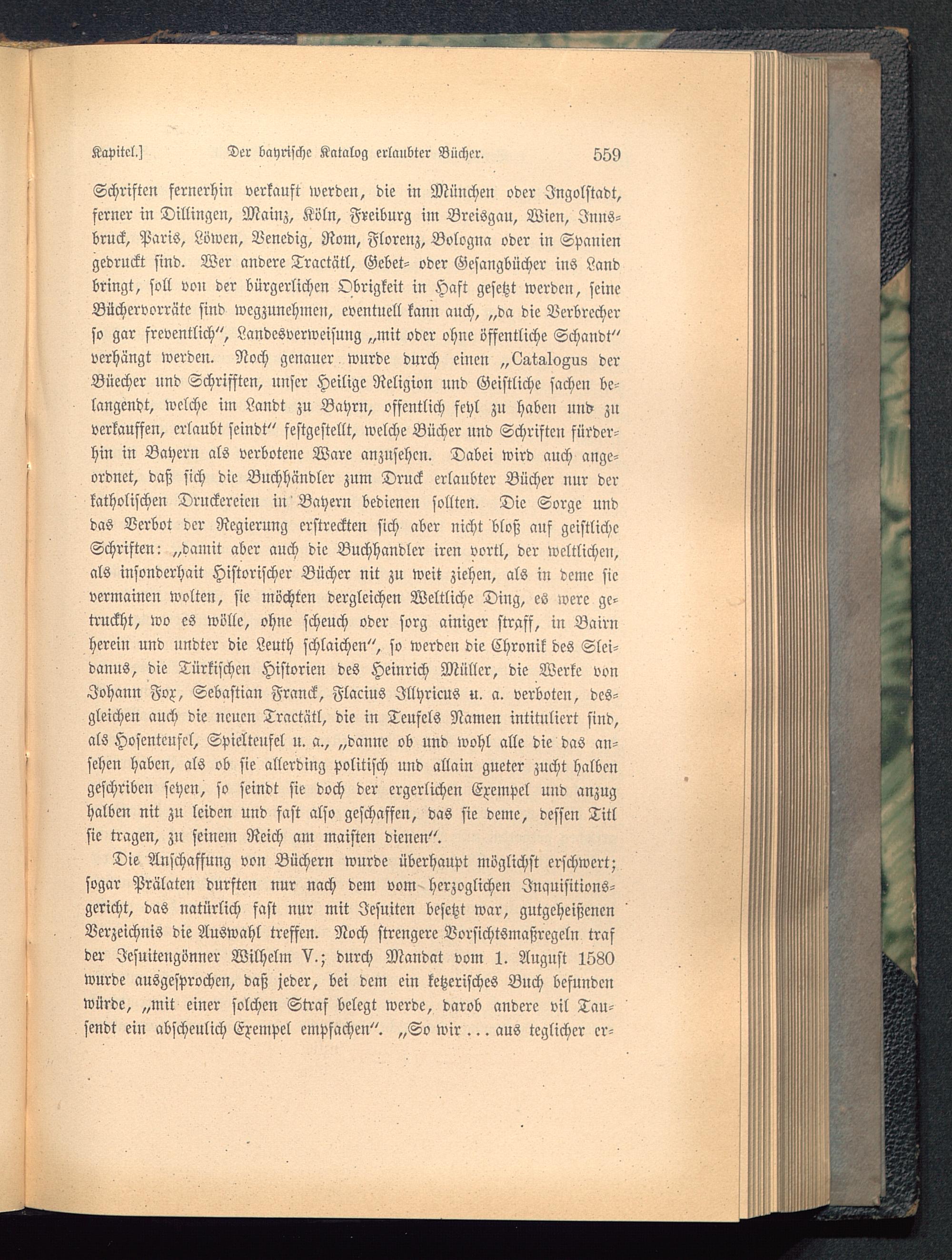 Schriften fernerhin verkauft werden, die in München oder Jngolstadt,ferner in Dillingen, Mainz, Köln, Freiburg im Breisgau, Wien, Inns-bruck, Paris, Löwen, Venedig, Rom, Florenz, Bologna oder in Spanien gedruckt sind. Wer andere Tractätl, Gebet- oder Gesangbücher ins Landbringt, soll von der bürgerlichen Obrigkeit in Haft gesetzt werden, seineBüchervorräte sind wegzunehmen, eventuell kann auch, „da die Verbrecherso gar freventlich", Landesverweisung „mit oder ohne öffentliche Schandt"verhängt werden. Noch genauer wurde durch einen „Lata-Iogus derBüecher und Schrisften, unser Heilige Religion und Geistliche sachen be-langend^, welche iln Landt zu Bahrn, öffentlich fehl zn haben lind znverkauften, erlaubt seindt" festgestellt, welche Bücher und Schriften fürder-hin in Bahern als verbotene Ware anzusehen. Dabei wird auch ange-ordnet, daß sich die Buchhändler zum Druck erlaubter Bücher nur derkatholischen Druckereien in Bahern bedienen sollten. Die Sorge unddas Verbot der Regierung erstreckten sich aber nicht bloß auf geistlicheSchriften: „damit aber auch die Buchhändler iren vortl, der weltlichen,als insonderhait Historischer Bücher nit zu weit ziehen, als in deme sievermainen wolten, sie möchten dergleichen Weltliche Ding, es were ge-truckht, wo es wolle, ohne scheuch oder sorg ainiger straff, in Bairnherein und undter die Leuth schlaichen", so werden die Chronik des Slei-danus, die Türkischen Historien des Heinrich Müller, die Werke vonJohann Fox, Sebastian Franck , Flacius Jllhricus u. a. verboten, des-gleichen auch die neuen Tractätl, die in Teufels Namen intituliert sind,als Hosentcufcl, Spielteufel u. a., „danne ob und wohl alle die das an-sehen haben, als ob sie allerding politisch und allain gueter zucht halbengeschribcn sehen, so seindt sie doch der ergerlichcn Exempel und anzughalben nit zn leiden und fast also geschaffen, das sie deme, dessen Titlsie tragen, zn seinein Reich am maisten dienen".