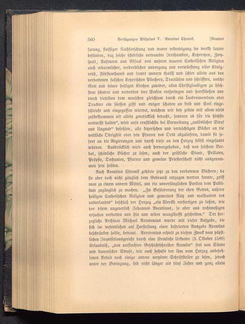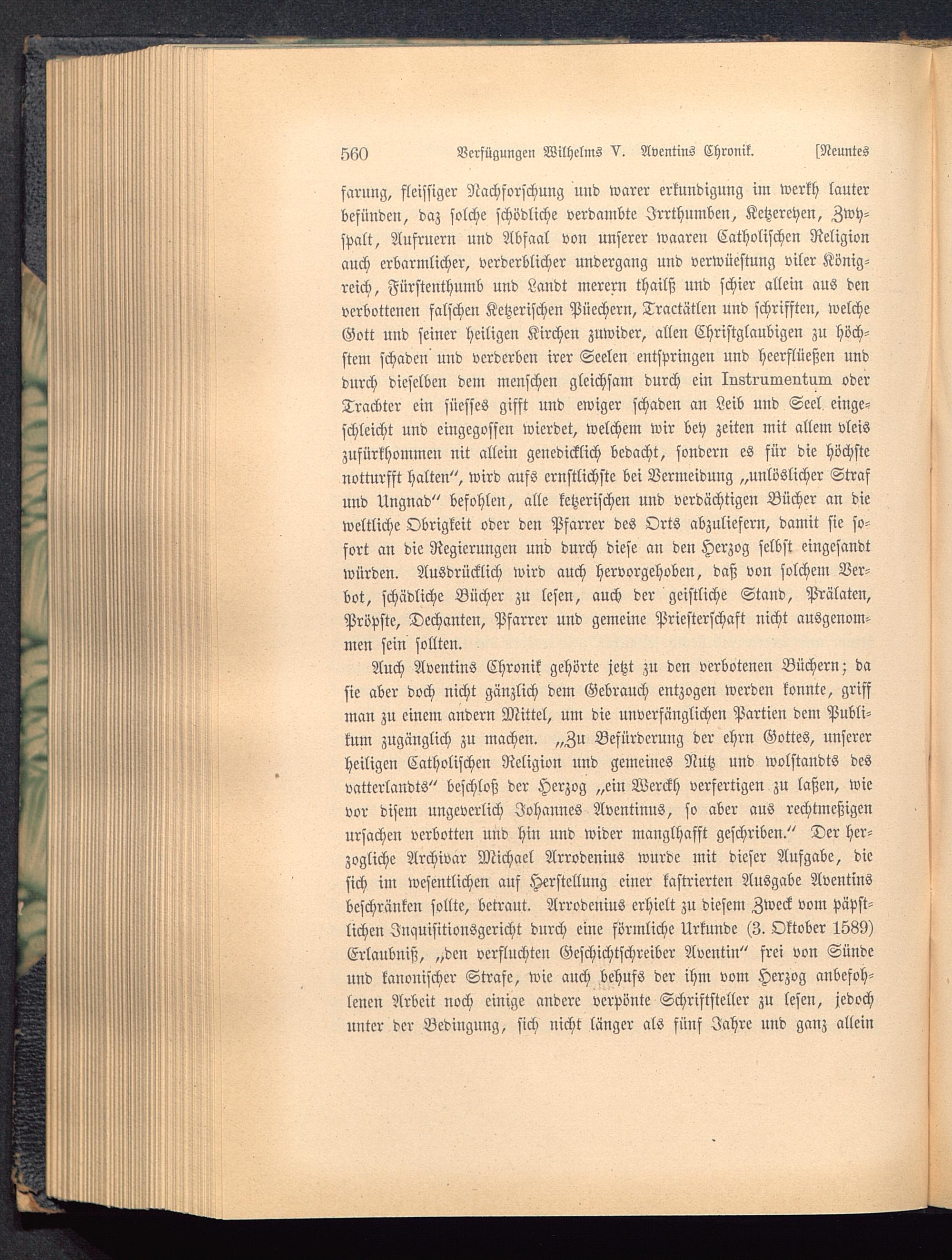 Auch Aventins Chronik gehörte jetzt zu den verbotenen Büchern; dasie aber doch nicht gänzlich dem Gebrauch entzogen werden konnte, griffman zu einem andern Mittel, um die unverfänglichen Partien dem Publi-kum zugänglich zu machen. „Zu Besürdcruug der ehrn Gottes, unsererheiligen Catholischen Religion und gemeines Nütz und wolstandts desvatterlandts" beschloß der Herzog „ein Werckh verfertigen zu laßen, wievor disem ungevcrlich Johannes Aventinus , so aber aus rechtmeßigenUrsachen vcrbotten und hin und wider manglhafft geschriben." Der her-zogliche Archivar Michael Arrodenius wurde mit dieser Aufgabe, diesich im wesentlichen auf Herstellung einer kastrierten Ausgabe Aventinsbeschränken sollte, betraut. Arrodenius erhielt zu diesem Zweck vom Päpst-lichen Jnquisitionsgericht durch eine förmliche Urkunde (3. Oktober 1589)Erlaubniß, „den verfluchten Geschichtschreiber Aventin" frei von Sündeund kanonischer Strafe, wie auch behufs der ihm vom Herzog anbefoh-lenen Arbeit noch einige andere verpönte Schriftsteller zu lesen, jedochunter der Bedingung, sich nicht länger als fünf Jahre und ganz allein