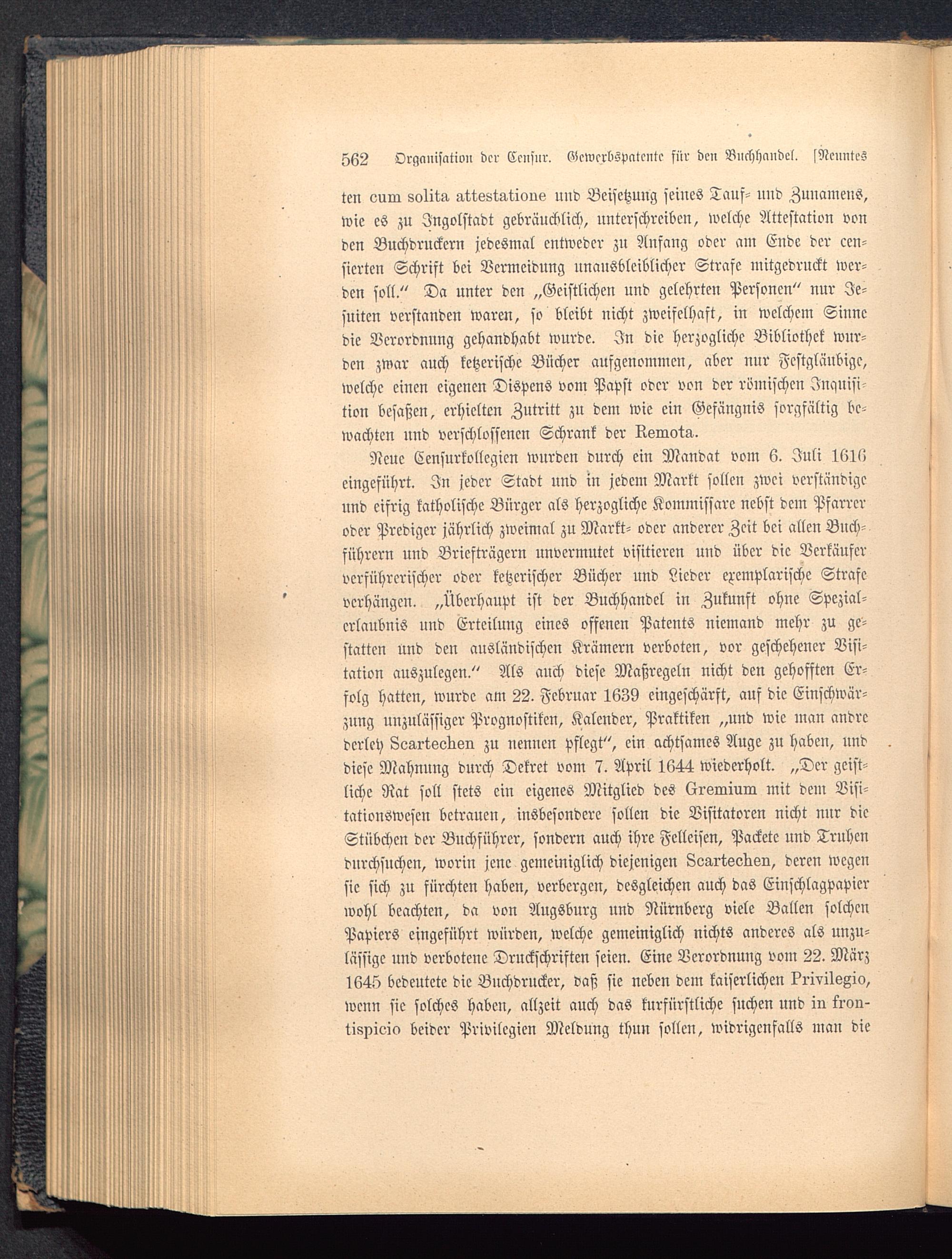 ten oum soliw attsLiaticiue und Beisetzung seines Tauf- und Zuuameus,wie es zu Jngolstadt gebräuchlich, unterschreiben, welche Attestaten vonden Buchdruckern jedesmal entweder zu Anfang oder am Ende der cen-sierten Schrift bei Vermeidung unausbleiblicher Strafe mitgedruckt wer-den soll." Da unter den „Geistlichen und gelehrten Personen" nur Je-suiten verstanden waren, so bleibt nicht zweifelhaft, in welchem Sinnedie Verordnung gehandhabt wurde. In die herzogliche Bibliothek wur-den zwar auch ketzerische Bücher aufgenommen, aber nur Fcstgläubigc,welche einen eigenen Dispens vom Papst oder von der römischen Inquisi-tion besaßen, erhielten Zutritt zu dem wie ein Gefängnis sorgfältig be-wachten und verschlossenen Schrank der Remote.