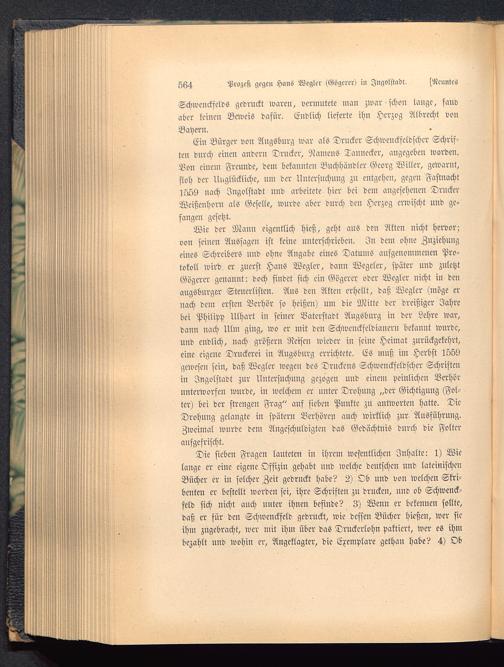 Die sieben Fragen lauteten iu ihrem wesentlichen Inhalte: 1) Wielange er eine eigene Offizin gehabt und welche deutschen und lateinischenBücher er in solcher Zeit gedruckt habe? 2) Ob und von welchen Skri-benten er bestellt worden sei, ihre Schriften zu drucken, nnv ob Schwenck-feld sich nicht auch unter ihnen befinde? 3) Wenn er bekennen sollte,daß er für den Schwcnckfeld gedruckt, wie dessen Bücher hießen, wer sieihm zugebracht, wer mit ihm über das Druckerlohn paktiert, wer es ihmbezahlt und wohin er, Angeklagter, die Exemplare gethan habe? 4) Ob