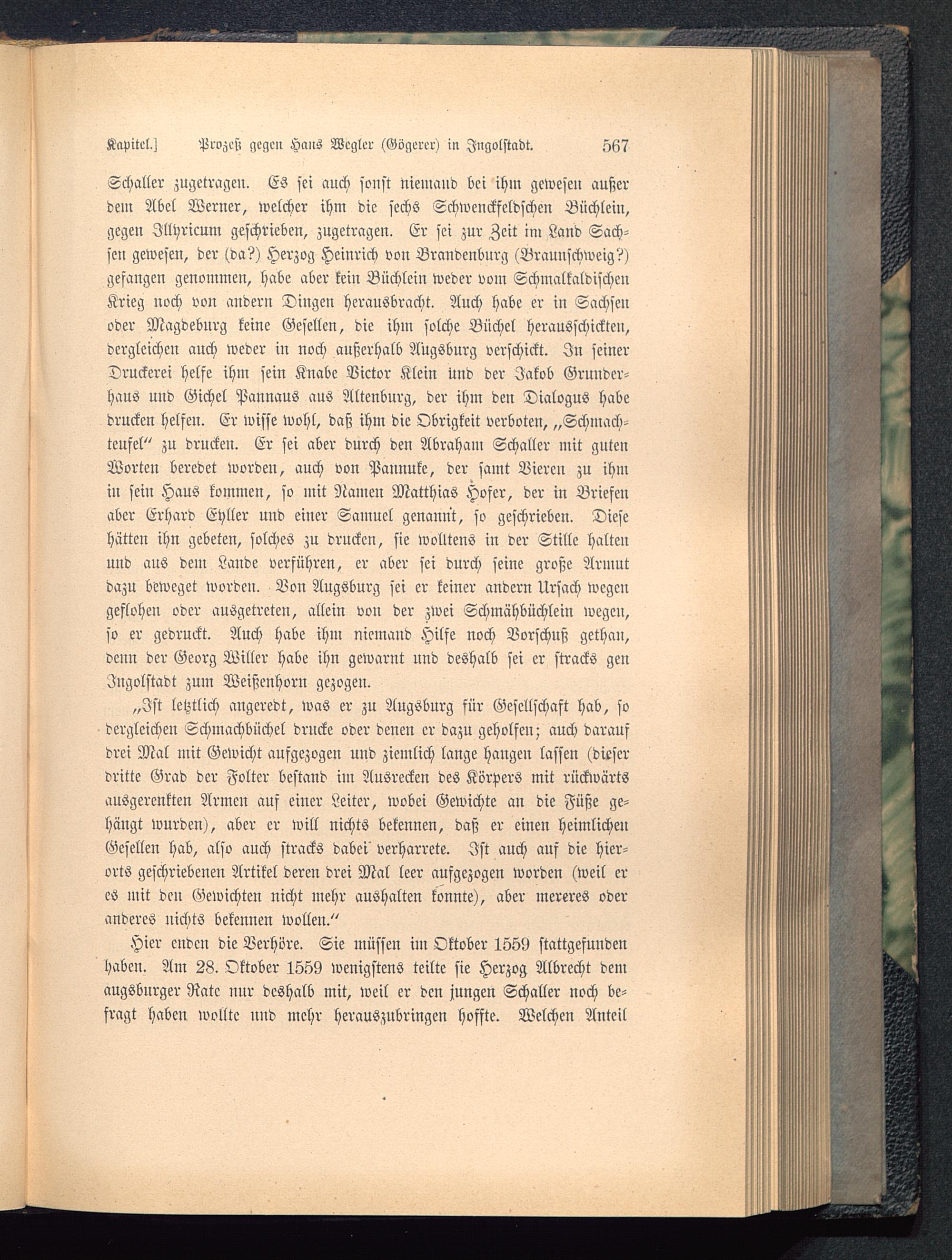 „Ist letztlich angeredt, was er zu Augsburg für Gesellschaft hab, sodergleichen Schmachbüchel drncke oder denen er dazu geholfen; auch daraufdrei Mal mit Gewicht aufgezogen und ziemlich lange hangen lassen (dieserdritte Grad der Folter bestand im Ausrecken des Körpers mit rückwärtsausgerenkten Armen auf einer Leiter, wobei Gewichte an die Füße ge-hängt wurden), aber er will nichts bekennen, daß er einen heimlichenGesellen hab, also auch stracks dabei' verharret«. Ist auch auf die hier-orts geschriebenen Artikel deren drei Mal leer aufgezogen worden (weil eres mit den Gewichten nicht mehr aushalten konnte), aber mereres oderanderes nichts bekennen wollen."