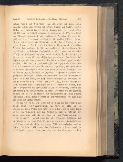 andern Fürsten und Reichsstädte, noch „schändliche und üppige Liederausgehn lassen, ohne Wissen und Willen Meister und Rats". Letztereblieben aber trotzdem bei der frühern Praxis, nicht eher einzuschreiten,als bis inan sie deshalb ansprach; so untersagten sie 1514 den Druckvon Muruers „Gcnchmatt" erst, uachdcm die Barfüßer, die einen An-griff auf ihre Lebensweise argwöhnten, sich darüber beschwert hatten:Murner erhielt jedoch sein Manuskript zurück. Um die Verbote zu um-gehen, setzten die Drucker bald ihre Namen nicht unter die bedenklichenTraktate, bald verbargen sie sich unter erdichteten. In der hieraus fürden Magistrat erstehenden Verlegenheit berief er, wenn eine namenloseSchrift als beleidigend angegeben wurde, sämtliche Drucker und fordertesie auf, bei ihrem Eid den Schuldigen zu nennen. Im Jahre 1515liefen Klagen ein über „schantliche Sprüche und Lieder" gegen die Eid-genossen, 1516 über ein „würtembcrgisch Lied" gegen die Kaiserlichen.Der Rat erneuerte die alteu Verbote und fügte hinzu, man solle nichtsneues derart herausgeben, es sei denn zuvor „durch den Ammeister oderden Doktor (Brant) besichtigt und zugelassen": offenbar eine schwer aus-zuführende Maßregel. Weder der Ammeister noch der Stadtschreiberhatten die uötige Muße, um selbst kleinere Schriften zu untersuchen, be-vor sie unter die Presse kamen. Im Jahre 1520, als die religiöse Po-lemik begonnen hatte, erließ dann der Rat abermals ein Verbot, nichtum die Besprechung der theologischen Fragen zu verhindern, sondern nur,um grobeu Beleidigungen Einhalt zu thun. Er strafte nie die Verfasser,er biclt sich an die Buchdrucker uud Buchhändler,- und diese wurden,summarisch genug, durch Konfiskation und Vernichtung der noch nichtverkauften Exemplare bestraft.