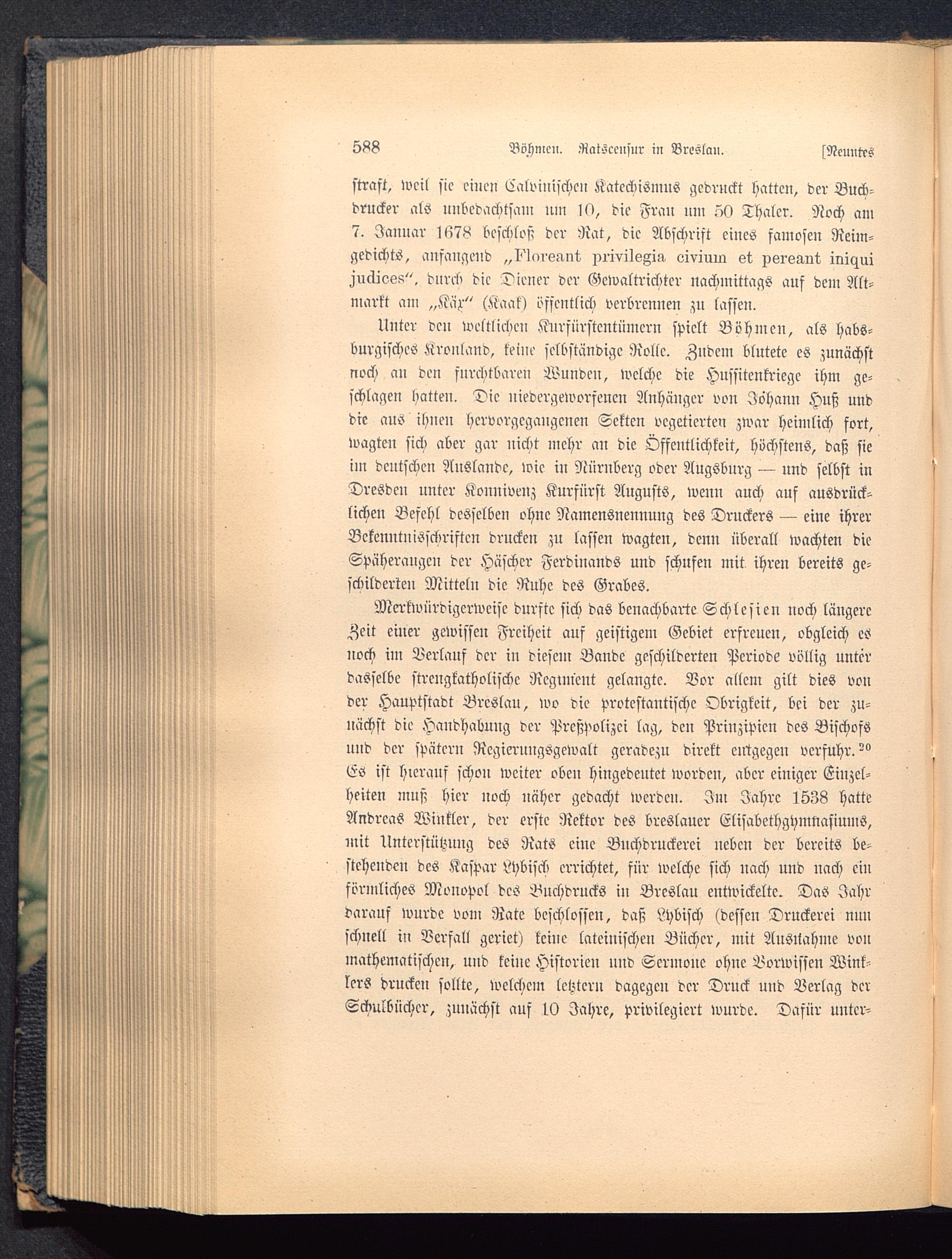 Merkwürdigerweise durste sich das benachbarte Schlesien noch längereZeit einer gewissen Freiheit auf geistigem Gebiet erfreuen, obgleich esnoch im Verlauf der in diesem Bande geschilderten Periode völlig unterdasselbe strengkatholische Regiment gelangte. Bor allem gilt dies vonder Hauptstadt Brcslau, wo die protestantische Obrigkeit, bei der zu-nächst die Handhabung der Preßpolizci lag, deu Prinzipien des Bischofsund der spätern Rcgicrnugsgewalt geradezu direkt eittgegeu verfuhr."°Es ist hierauf schon weiter oben hingedeutet worden, aber einiger Einzel-heiten muß hier noch näher gedacht werden. Im Jahre 1538 hatteAndreas Winkler, der erste Rektor des breslauer Elisabcthgymnasiums,mit Unterstützung des Rats eine Buchdruckerci neben der bereits be-stehenden des Kaspar Lybiseb errichtet, für welche sich nach und nach einförmliches Monopol des Buchdrucks iu Breslau entwickelte. Das Jahrdarauf wurde vom Rate beschlossen, daß Lhbisch (dessen Druckerei nunschnell in Verfall geriet) keine lateinischen Bücher, mit Ausnahme voumathematischen, und keine Historien uud Sermone ohue Vorwissen Winl-lerS drucken sollte, welchen, letztem dagegen der Druck und Verlag derSchulbücher, zunächst auf 10 Jahre, privilegiert wurde. Dafür unter-