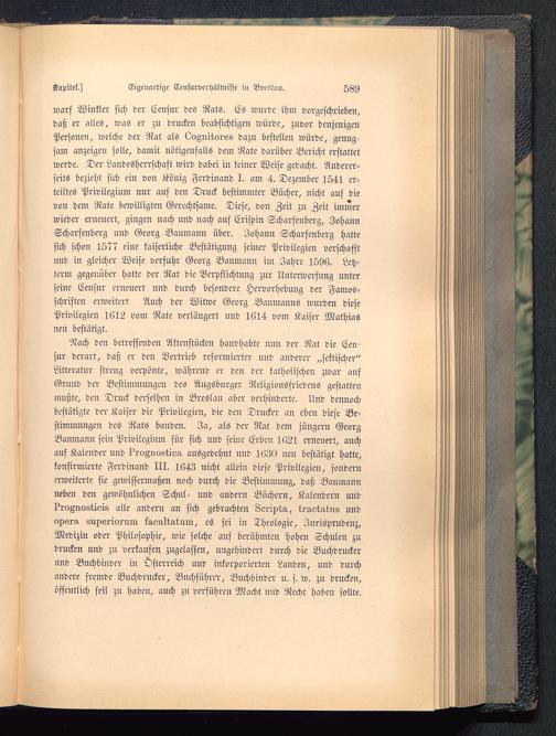 warf Winkler sich der Censur des Rats. Es wurde ihm vorgeschrieben,daß er alles, waS er zu drucken beabsichtigen würde, zuvor denjenigenPersonen, welche der Rat als LoZnitorss dazu bestellen würde, genug/sam anzeigen solle, damit nötigenfalls dem Rate darüber Bericht erstattetwerde. Der Landesherrschaft wird dabei in keiner Weise gedacht. Anderer-seits bezieht sich ein von König Ferdinand I. am 4. Dezember 1541 er-tciltes Privilegium nur auf den Druck bestimmter Bücher, nicht auf dievon dem Rate bewilligten Gerechtsame. Diese, von Zeit zu Zeit immerwieder erneuert, gingen nach und nach auf Crispin Scharfenberg, JohannScharfenberg und Georg Baumann über. Johann Scharfenberg hattesich schon 1577 eine kaiserliche Bestätigung seiner Privilegien verschafftnnd in gleicher Weise verfuhr Georg Baumann im Jahre 1596. Letz-ter», gegenüber hatte der Rat die Verpflichtung znr Unterwerfung unterseine Censur erneuert nnd durch besondere Hervorhebung der Famos-schriftcn erweitert Auch der Witwe Georg Baumcmnö wurden diesePrivilegien 1612 vom Rate verlängert und 1614 vom Kaiser Mathiasneu bestätigt.
