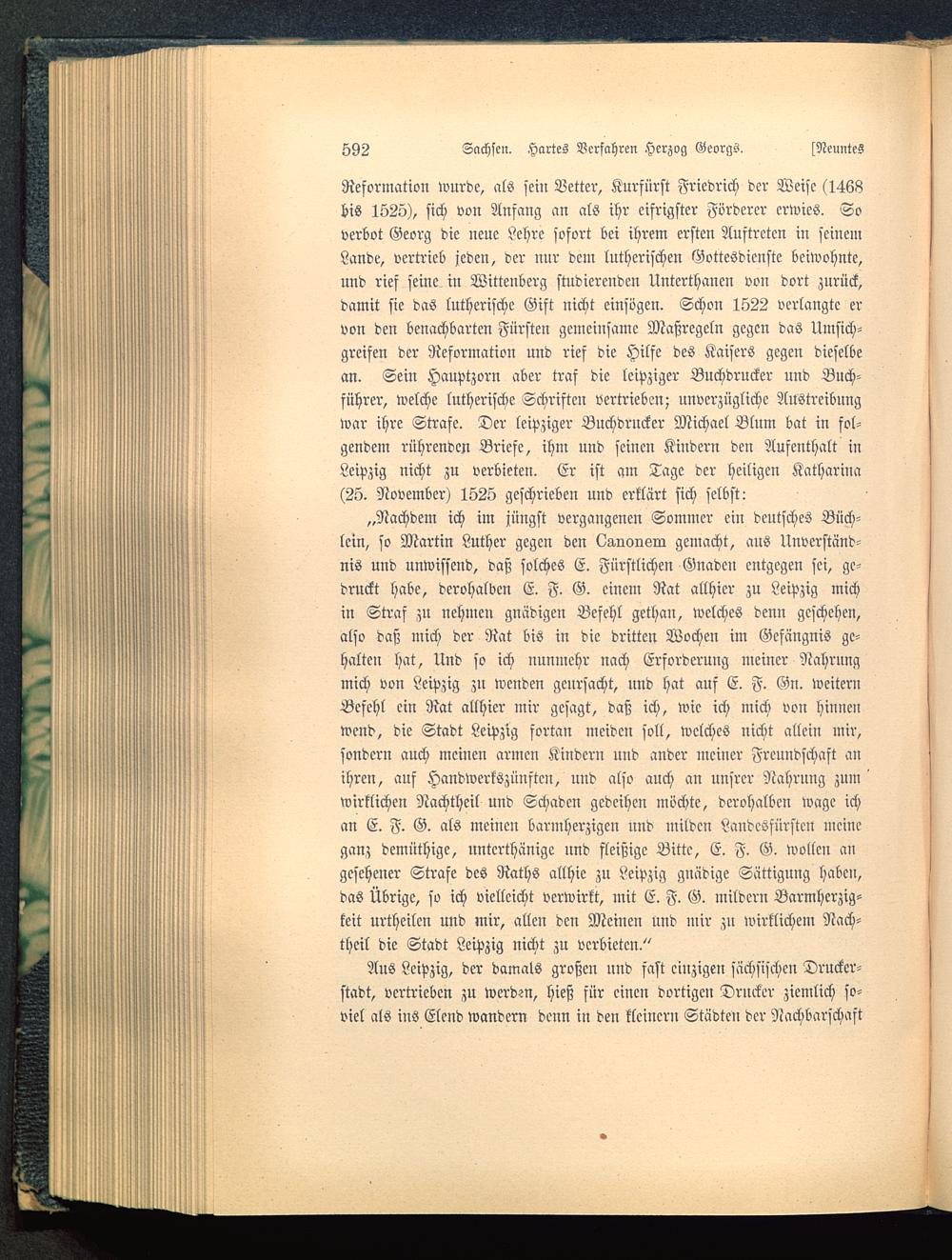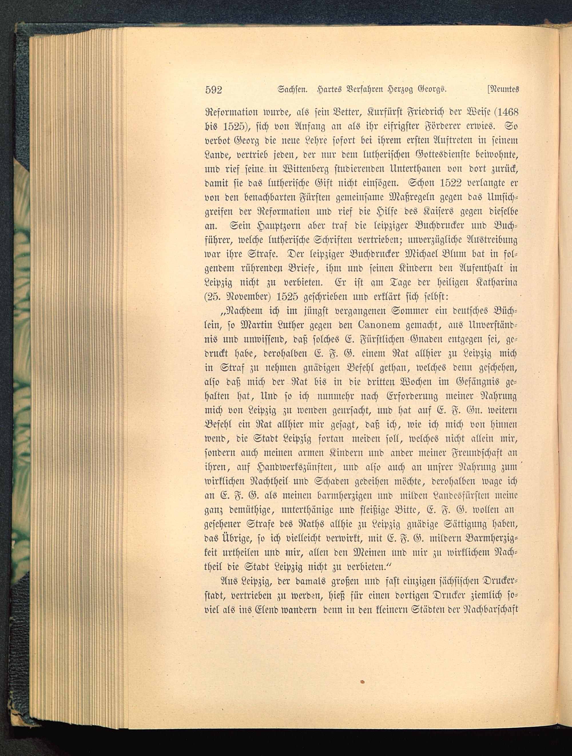 Reformation wurde, als sein Vetter, Kurfürst Friedrich der Weise (1468bis 1525), sich von Anfang an als ihr eifrigster Förderer erwies. Soverbot Georg die neue Lehre sofort bei ihrem ersten Auftreten in seinemLande, vertrieb jeden, der nur dem lutherischen Gottesdienste beiwohnte,und rief seine in Wittenberg studierenden Unterthanen von dort zurück,damit sie das lutherische Gift nicht einsvgcn. Schon 1522 verlangte ervon den benachbarten Fürsten gemeinsame Maßregeln gegen das Umsich-greifen der Reformation und rief die Hilfe des Kaisers gegen dieselbean. Sein Hauptzorn aber traf die leipziger Buchdrucker und Buch-führer, welche lutherische Schriften vertrieben; unverzügliche Austreibungwar ihre Strafe. Der leipziger Buchdrucker Michael Blum bat in fol-gendem rührenden Briefe, ihm und seinen Kindern den Aufenthalt inLeipzig nicht zu verbieten. Er ist am Tage der heiligen Katharina(25. November) 1525 geschrieben und erklärt sich selbst: