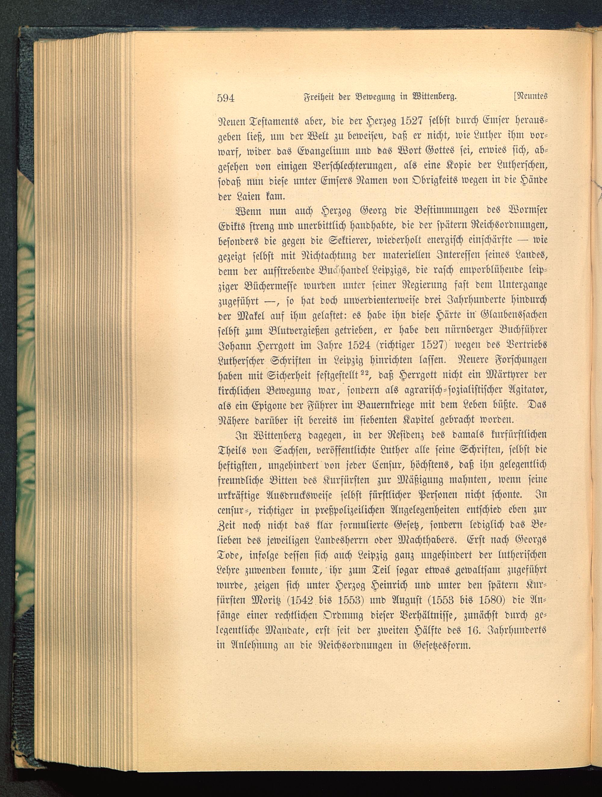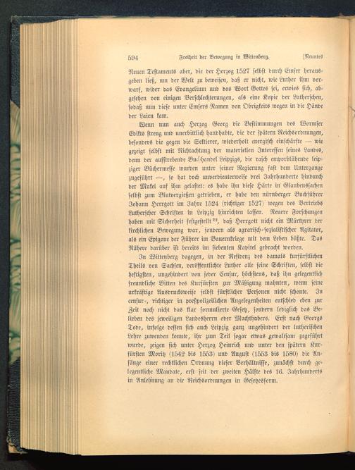 In Wittenberg dagegen, in der Residenz des damals kurfürstlichenTheils von Sachsen, veröffentlichte Luther alle seine Schriften, selbst dieheftigsten, ungehindert von jeder Ecnsur, höchstens, daß ihn gelegentlichfreundliche Bitten des Kurfürsten zur Mäßigung mahnten, wenn seineurkräftige Ausdrucksweise selbst fürstlicher Personen nicht schonte. Incensur-, richtiger in prcßpolizeilichen Angelegenheiten entschied eben zurZeit noch nicht das klär formulierte Gesetz, sondern lediglich das Be-lieben des jeweiligen Landesherrn oder Machthabers. Erst nach GeorgsTode, infolge dessen sich auch Leipzig ganz ungehindert der lutherischenLehre zuwenden konnte, ihr zum Teil sogar etwas gewaltsam zugeführtwurde, zeigen sich unter Herzog Heinrich und unter den spätern Kur-fürsten Moritz (1542 bis 1553) und August (1553 bis 1580) die An-fänge einer rechtlichen Ordnung dieser Verhältnisse, zunächst durch ge-legentliche Mandate, erst seit der zweiten Hälfte des 16. Jahrhundertsin Anlehnung an die Neichsordnungen in Gesetzesform.