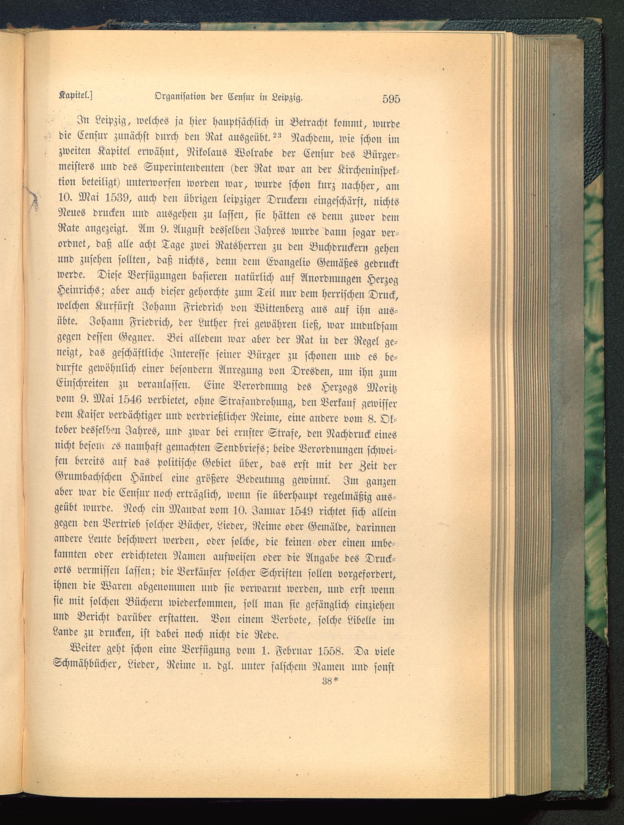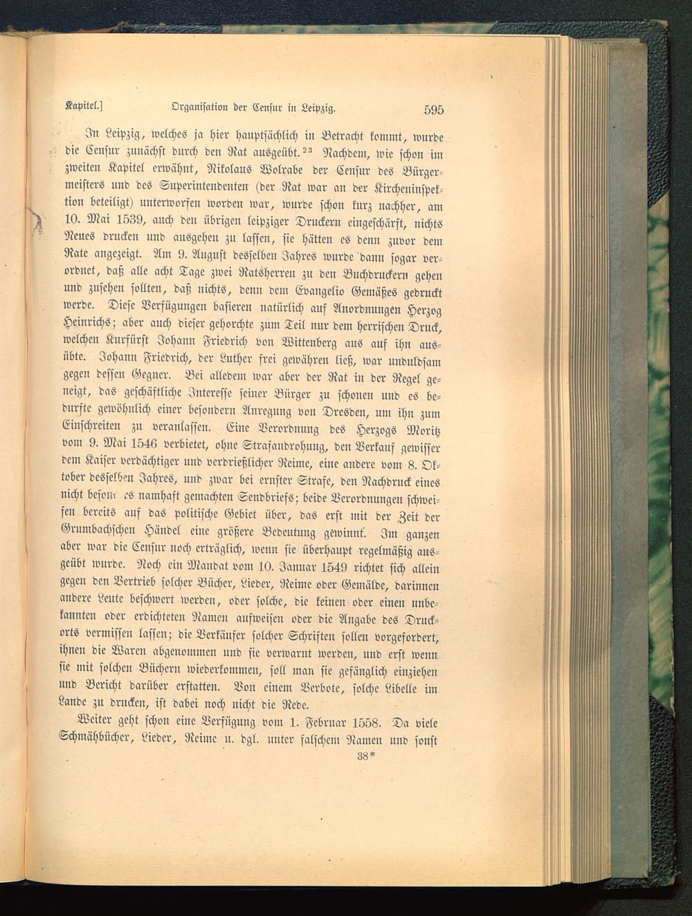 In Leipzig , welches ja hier hauptsächlich in Betracht kommt, wurdedie Censur zunächst durch den Rat ausgeübt. ^ Nachdem, wie schon imzweiten Kapitel erwähnt, Nikolaus Wolrabe der Censur des Bürger-meisters und des Superintendenten (der Rat war an der Kircheninspek-tion beteiligt) unterworfen worden war, wurde schon kurz nachher, am10. Mai 1539, auch deu übrigen leipziger Druckern eingeschärft, nichtsNeues drucken und ausgehen zu lassen, sie hätten es denn zuvor demRate augezeigt. Am 9. August desselben Jahres wurde dann sogar ver-ordnet, daß alle acht Tage zwei Ratsherren zu den Buchdruckern gehenund zusehen sollten, daß nichts, denn dem Cvcmgelio Gemäßes gedrucktwerde. Diese Verfügungen basieren natürlich auf Anordnungen HerzogHeinrichs; aber auch dieser gehorchte zum Teil nur dem herrischen Druck,welchen Kurfürst Johann Friedrich von Wittcnbcrg aus auf ihn aus-übte. Johann Friedrich, der Luther frei gewähren ließ, war unduldsamgegen dessen Gegner. Bei alledem war aber der Rat in der Regel ge-neigt, das geschäftliche Interesse seiner Bürger zu schonen und es be-dürfte gewöhnlich einer besondern Anregung von Dresden , um ihn zumEinschreiten zu veranlassen. Eine Verordnung des Herzogs Moritzvom 9. Mai 1546 verbietet, ohne Strafandrohung, den Verkauf gewisserdem Kaiser verdächtiger und verdrießlicher Reime, eine andere vom 8. Ok-tober desselben Jahres^ und zwar bei ernster Strafe, den Nachdruck einesnicht besom ^s namhaft gemachten Sendbriefs; beide Verordnungen schwei-fen bereits auf das politische Gebiet über, das erst mit der Zeit derGrumbachschcn Händel eine größere Bedeutung gewinnt. Im ganzenaber war die Censur noch erträglich, wcun sie überhaupt regelmäßig aus-geübt wurde. Noch ciu Mandat vom 10. Januar 1549 richtet sich alleingegen den Vertrieb solcher Bücher, Lieder, Reime oder Gemälde, darinnenandere Leute beschwert werde», oder solche, die keinen oder einen unbe-kannten oder erdichteten Namen ausweisen oder die Angabe des Druck-orts vermissen lassen; die Verkäufer solcher Schriften sollen vorgefordert,ihnen die Waren abgenommen und sie verwarnt werden, und erst wennsie mit solchen Büchern wiederkommen, soll man sie gefänglich einziehenund Bericht darüber erstatten. Von einem Verbote, solche Libelle imLande zu drucken, ist dabei noch nicht die Rede.