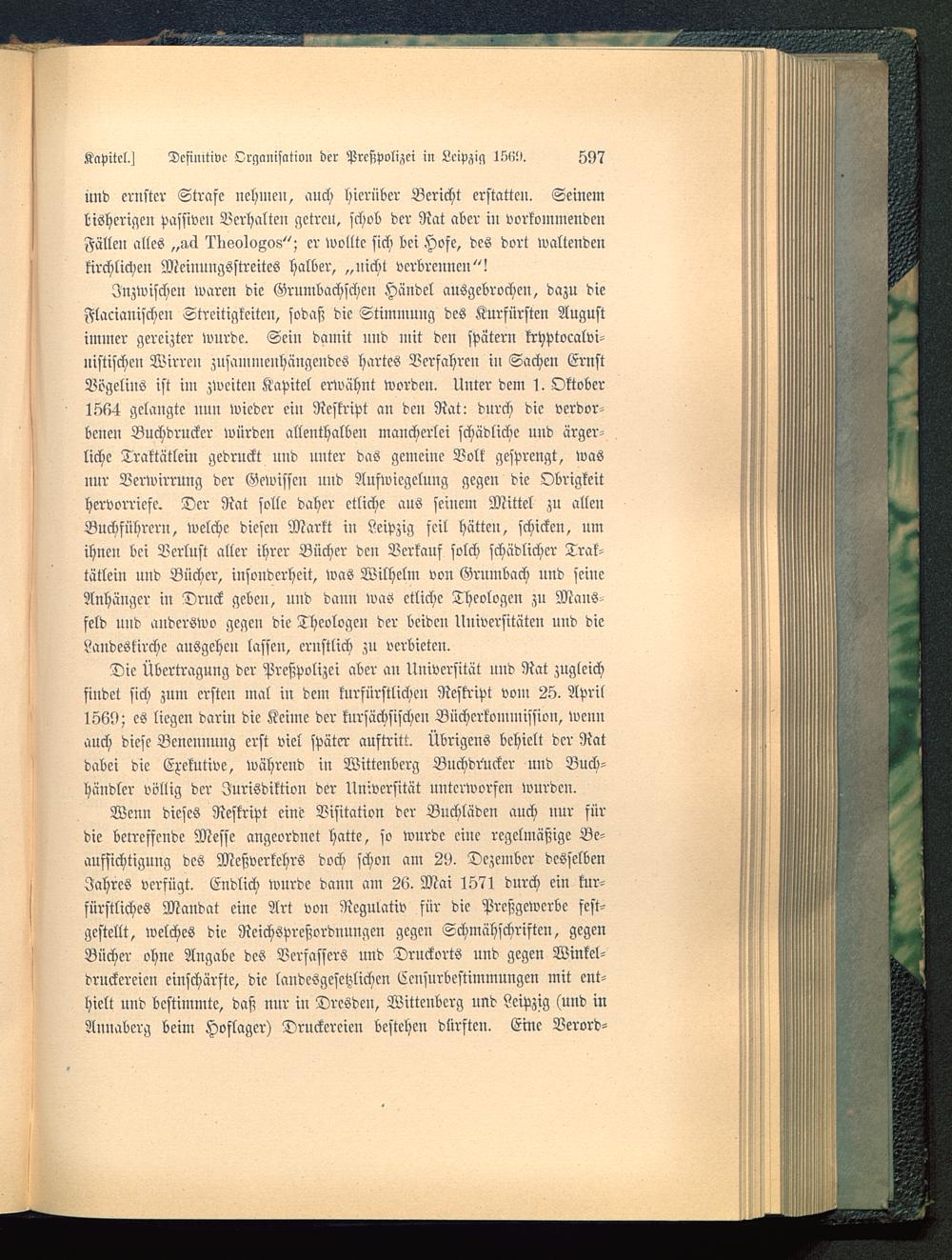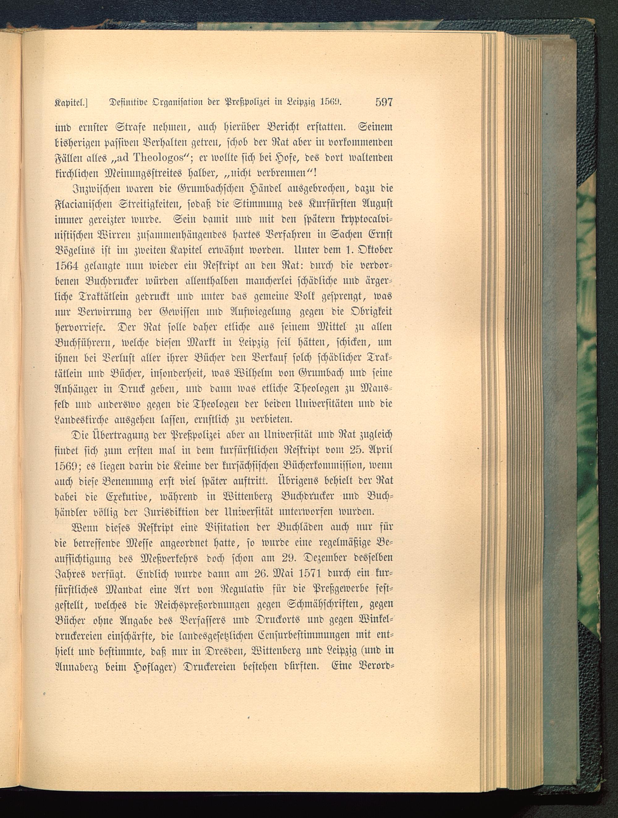 Die Übertragung der Preßpolizei aber au Universität und Rat zugleichfindet sich zum ersten mal in dem kurfürstlichen Reskript vom 25. April1569; es liegen darin die Keime der kursächsischen Büchcrkommission, wennauch diese Benennung erst viel später auftritt. Übrigens behielt der Ratdabei die Exekutive, während in Wittenberg Buchdrucker und Buch-händler völlig der Jurisdiktion der Universität unterworfen wurden.