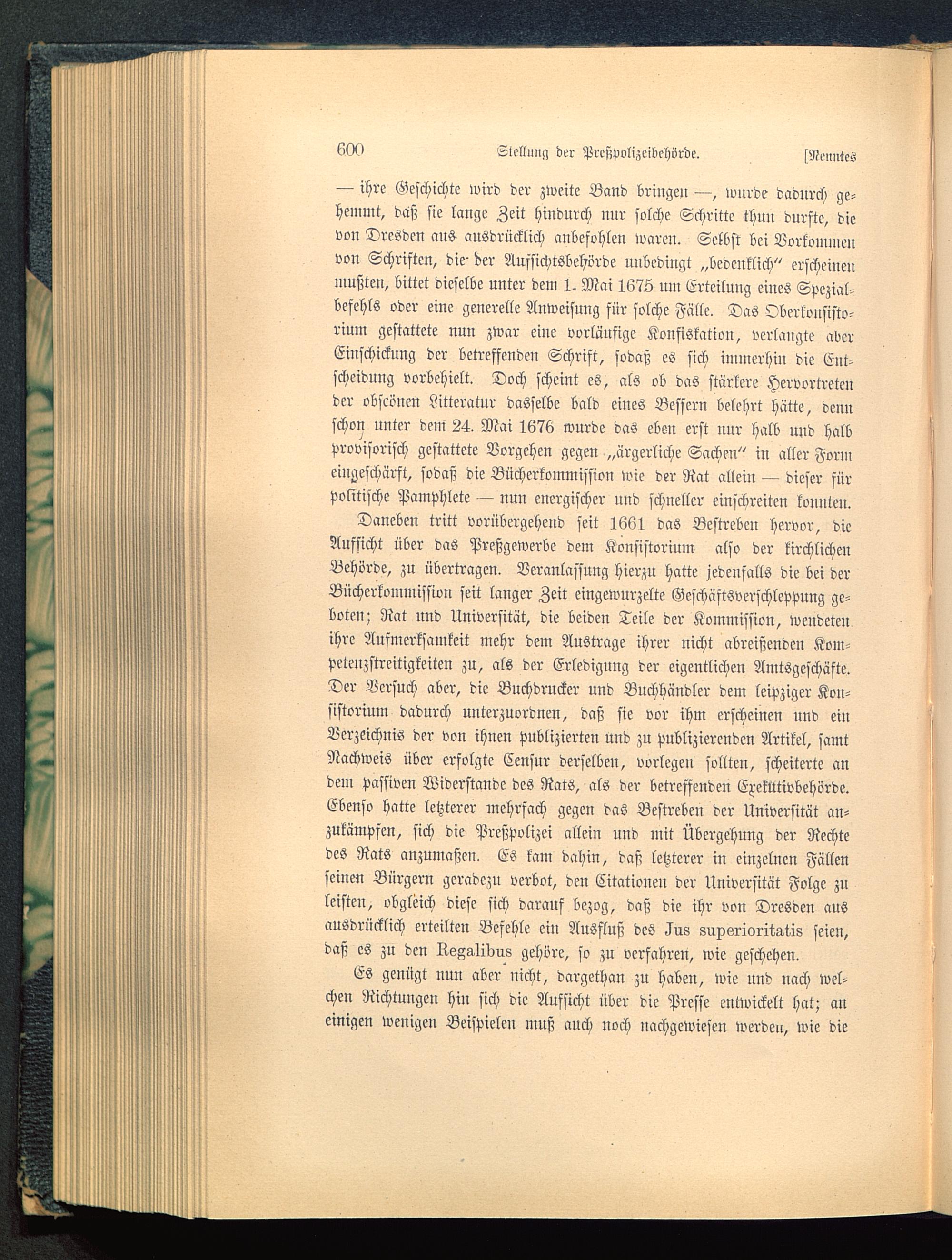 Daneben tritt vorübergehend seit 1661 das Bestreben hervor, dieAufsicht über das Preßgewerbc dem Konsistorium also der kirchlichenBehörde, zu übertragen. Veranlassung hierzu hatte jedenfalls die bei derBüchcrkoniinission seit langer Zeit eingewurzelte Geschäftsverschleppung ge-boten; Rat und Universität, die beiden Teile der Kommission, wendetenihre Aufmerksamkeit mehr dem Austrage ihrer nicht abreißenden Koin-petenzstreitigkeiten zu, als der Erledigung der eigentlichen Amtsgeschäftc.Der Versuch aber, die Buchdrucker und Buchhändler dem leipziger Kon-sistorium dadurch unterzuordnen, daß sie vor ihm erscheinen und einVerzeichnis der von ihnen publizierten und zu publizierenden Artikel, samtNachweis über erfolgte Censur derselben, vorlegen sollten, scheiterte andem passiven Widerstände des Rats, als der betreffenden Exekütivbehörde.Ebenso hatte letzterer mehrfach gegen das Bestreben der Universität an-zukämpfen, sich die Preßpolizei allein und mit Übergehung der Rechtedes Rats anzumaßen. Es kam dahin, daß letzterer in einzelnen Fällenseinen Bürgern geradezu verbot, den Citationen der Universität Folge zuleisten, obgleich diese sich darauf bezog, daß die ihr von Dresden ausausdrücklich erteilten Befehle ein Ausfluß des -lus 8uxsriorita.t.is seien,daß es zu den RsZglidus gehöre, so zu verfahren, wie geschehen.