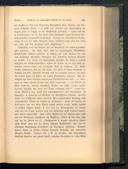Schließlich noch eiu Beispiel für das Verfahren der orthodox-lutheri-schen Censoren. Im Jahre 1697 hatte der kopcnhagener BuchhändlerErythropilus Auftrag gegeben, in Leipzig eine neue Auflage der ausdem Englischen übersetzten Predigten und Schriften Thomas Watsons zu drucken. Der Dekan der theologischen Fakultät, Dr. Alberti, zugleichMitglied der Bücherkommission, lehnte die Censur ab, da ihm nicht zu-gemutet werden könne, ein Calvinisch Buch zu eensieren. Die Buch-drucker beschwerten sich bei dem Rate: das Werk sei schon mehrmals inSachsen gedruckt, öffentlich verkauft und nie verboten worden; auf solcheArt würde ihnen die Arbeit für fremde Buchhändler entzogen. Auf eineEingabe des Rats entschied diesmal das Obcrkonsistorium doch — der Über-gang zu einer mildern Praxis war schou eingetreten —, das; Alberti dasWerk censieren, etwaige bedenkliche Stellen und solche «untra. ortuo-ckoxiaiQ streichen und dann deu Druck verstatten solle. ^ Jenes Ver-halten Alberti's war jedoch kein ausnahmswcises oder vereinzeltes; imGegenteil, es entsprang der Methode der theologischen Fakultät, aus dieseWeise das Erscheinen eines jedweden ihrer dogmatischen Stellung nichtentsprechenden Werks in Leipzig zu verhindern. Denn da Leipzig alsVerlagsort nur auf solche Werke gesetzt werden durfte, welche daselbstdie Censur passiert hatten, so war mit der Verweigerung der Censurnicht uur der Druck, sondern anch das Erscheinen nicht orthodox-lutheri-scher Werke unterdrückt. Aus diesem Mißbrauch des Censnrrcchts, nichtaus der Bedeutung Frankfurts als Meßplatz, erklärt es sich denn auch,daß um die Wende des 17. Jahrhunderts so manche bedeutende theolo-gische Werte zwar mit der Firma leipziger Buchhändler, aber mit deralleinigen Bezeichnung Frankfurts als Verlagsort erschienen. Beispielehierfür bieten die Firma Johann Friedrich Gleditsch , und namentlichThomas Fritsch. Letzterer ließ z. B die Kirchen- und KetzerhistorieGottfried Arnolds und andere Werke desselben Verfassers in dieser Weise