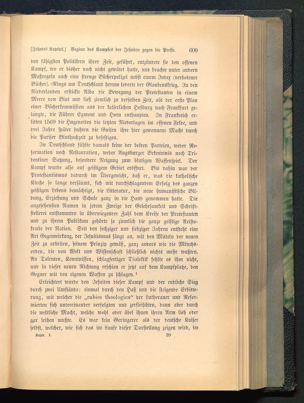 den fähigsten Politikern ihrer Zeit, geführt, entzündete sie den offenenKampf, wo er bisher noch nicht gewütet hatte, und brachte nnter andernMaßregeln auch eine strenge Bücherpolizei nebst einem Index (verbotenerBücher). -Rings um Deutschland herum loderte der Glaubenskrieg. In denNiederlanden erstickte Alba die Bewegung der Protestanten in einemMeere von Blut und ließ ziemlich zu derselben Zeit, als der erste Planeiner Bücherkommission aus der kaiserlichen Hofburg nach Frankfurt ge-langte, die Führer Egmont und Horn enthaupten. In Frankreich er-litten 1569 die Hugenotten die letzten Niederlagen im offenen Felde, unddrei Jahre später suchten die Guisen ihre hier gewonnene Macht durchdie Pariser Bluthochzeit zu befestigen.