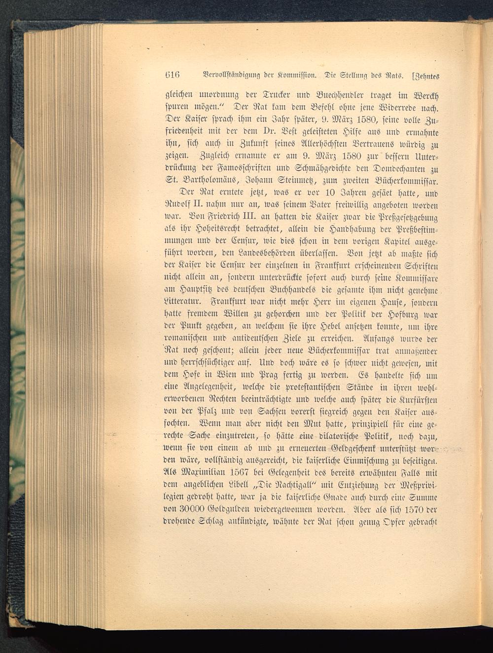 Der Rat erntete jetzt, was er vor 10 Jahren gesäet hatte, undRudolf II. nahm nur au, was seinem Bater freiwillig angeboten wordenwar. Von Friedrich III. an hatten die Kaiser zwar die Preßgcsetzgebnngals ihr Hoheitsrecht betrachtet, allem die Handhabung der Preszbcstim-mungen und der Censur, wie dies schon in dem vorigen Kapitel ausge-führt worden, den Landesbehörden überlassen. Von jetzt ab maßte sichder Kaiser die Censur der einzelnen in Frankfurt erscheinenden Schriftennicht allein an, sondern unterdrückte sofort auch durch seine Kommissaream Hauptsitz des deutschen Buchhandels die gesamte ihm nicht genehmeLitteratur. Frankfurt war uicht mehr Herr im eigenen Hause, sonderuhatte fremdem Willen zu gehorchen uud der Politik der Hofburg warder Punkt gegeben, an welchem sie ihre Hebel ansetzen konnte, um ihreromanischen und antideutsche» Ziele zu erreichen. Anfangs wurde derRat noch geschont; allein jeder neue Bücherkommissar trat anmaßenderund herrschsüctiger auf. Und doch wäre es so schwer nicht gewesen, mitdem Hofe iu Wien und Prag fertig zu werden. Es handelte sich umeine Angelegenheit, welche die protestantischen Stände in ihren wohl-erworbenen Rechten beeinträchtigte und welche auch später die Kurfürstenvon der Pfalz und von Sachsen vorerst siegreich gegell den Kaiser aus-fochten. Wenn man aber nicht den Mut hatte, prinzipiell für eine ge-rechte Sache einzutreten, so hätte eine dilatorische Politik, noch dazu,weun sie von einem ab nnd zu erneuerten Geldgeschenk unterstützt wor->den wäre, vollständig ausgereicht, die kaiserliche Einmischung zn beseitigen.Als Maximilian 1567 bei Gelegenheit des bereits erwähnten Falls mitdem angeblichen Libcll „Die Nachtigall" mit Entziehung der Mcßprivi-lcgicn gedroht hatte, war ja die kaiserliche Gnade auch durch eiue Tuuuncvon 30000 Goldguldeu wiedergewonnen worden. Aber als sich 1570 derdrohende Schlag ankündigte, wähnte der Rat schon genug Opfer gebracht