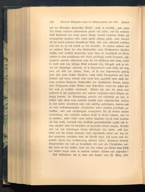 init von Römischer Kaiserlicher Macht", heißt es wörtlich, „vnd gebenDir hiertzu vnnseren volkomincnen gewalt vnd willen, das Du entwederselbst Persönlich oder durch andere hiertzu treulich deputierte fürhin aufvorangedeute vngebuer aller ortten guethe achtung gebest, vnnd bevorabvff Jtzt herbey nahender Franckfurter Meß, alsso auch außerhalb derselbenwan vnd wo eß dich nöttich zu sein beduncket, In vnseren nahmen vndan »unserer Stadt bei allen Buchtruckher vnnd Buchhendlern hierübervlaissig vnnd ernstlich Jnquirirest, vonn Inen ein verzeichnuß der Neueuzeithero iu allen Professionen sud titulo xrivilsgi^ nostri Laesg-rsi, auß-gangenen oxerum abpfordren vnnd bei den pflichtenn vnnd aiden, damitsie vnnß vnnd dem heiligen Reich verwandt sein, befragest, auch zu edi-ren vud fürzuelegen anhaltest, ob sh Impressoria vonn vnnß, wie langvnilt. aus viell Jar habent; Itsm, ob sie dem Imxr688vrio zuevolgjeder Zeit vonn solchen Buechern, vnnß etliche Lxsmxlarig, auf IrenCostenn auch wann, wieuiel vnnd durch wem zugeschickt vnnd vnnß als-dann derselben Authores, Buchtruckher vnd Buchhändler Namen, sammteiner Designation solcher Bücher vnnd Schrieffteu, daruf den fachen hal-ben nach zu denckhen vbersendest. Befindt sich aber bei einem odermehreren in Jtzt spezifizierten oder anderer dergleichen diesen Dingen an-hengig Puncten, die Vbertrettung notoris vnd wissentlich zue sein, sosollestu nicht allein vonn denselben strackhs vnser Jmpressorium (wofernsie eins haben) abvorderen vnnd vnß dasselbig zuefertigenn, sondern auchall diese verstandtnermaßen ol^nässtins vnder vnnserm xrivilsZici ge-druckten, oder auch verschwiegene exeraxlaria biß vff weitere vnnsereverordtnung, mit vorbehält vnnserer straff in Arrest nehmen, oder dadu sonnsten, außer dieses einen andern fueglichen Proceß vnnd moäumalß diese weißt, dordurch diese stt'effliche gemeinschedtliche arglist vnd be-trug abgestelt vnnd die vberfohrer an tag bracht werden müegen, Sollestuoder der von deinetwegen hiertzu subdelegirt seiu würdt, auff dem-selbeu vns alle hiertzu dienesame vnnd ersprießliche Mittel vnd weg sol-ches exequieren, verrichten vnnd ins Werckh setzen, dich daran auch nie-mandts einrcdt oder Verhinderung, abhalten lassen, Sonndern vielmehrBurgermeister vnd rath zu Franckfurtt, wie auch alle Obrigkeitten, wel-cher enden es von Nöthen, vnnß vnd dem rechten zue Steuer vnnd Hülffvon vnnsert wegen vnnd in vnnserm nahmen ersuchen vnd ansprechen."Best substituierte sich in einer aus Speher vom 22. März 1597