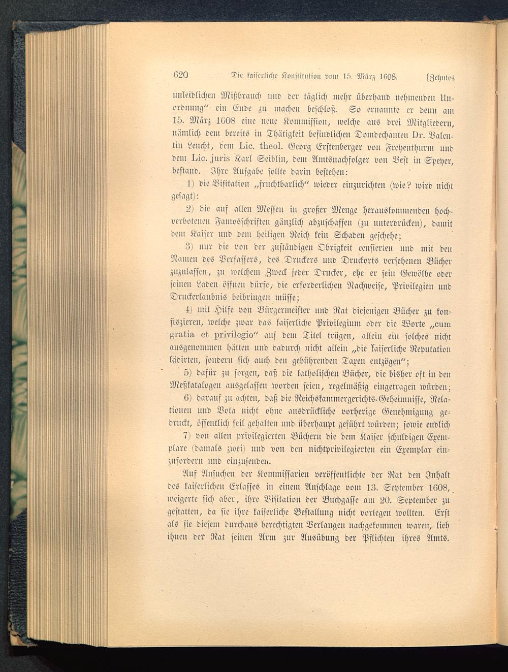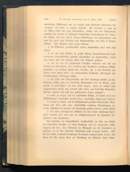 4) mit Hilfe von Bürgermeister nnd Rat diejenigen Bücher zu kon-fiszieren, welche zwar das kaiserliche Privilegium oder die Worte „ouiu^ra-tis, et privilogio" auf dem Titel trügen, allein ein solches nichtausgenommen hätten und dadurch nicht allein „die kaiserliche Reputationlädirtcn, sondern sich auch den gebührenden Taxen entzögen";