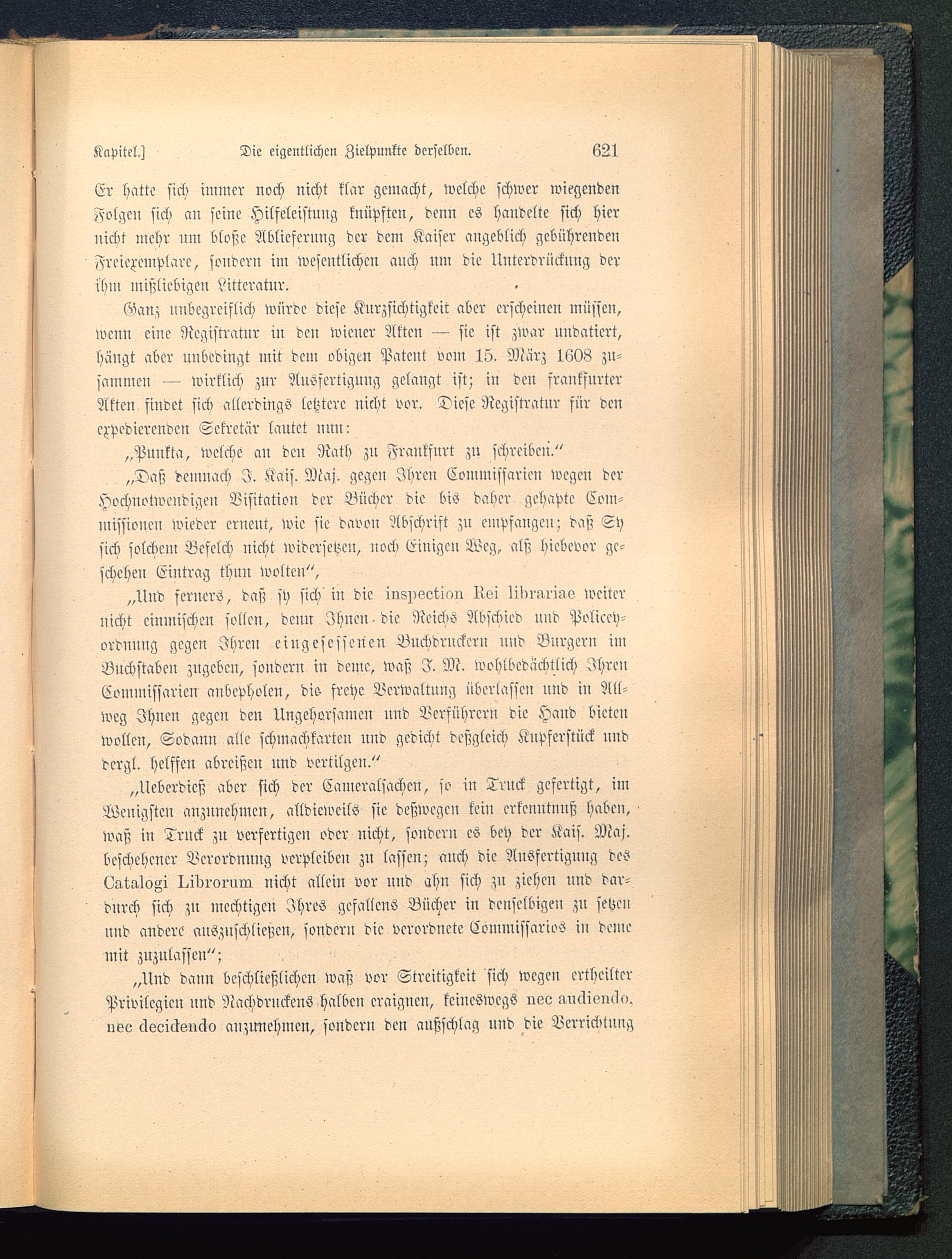 „Ueberdicß aber sich der Cameralsachcn, so iu Truck gefertigt, imWenigsten anznnehmen, alldiciocilö sie deßwegen kein erkemitmiß haben,waß in Trnck zu verfertigen oder nicht, sondern es bey der Kais. Maj.bcsckehcncr Verordnung verpleibcu zu lassen; anch die Ausfertigung des(^,wloz;i I.iw-01-nra nicht allein vor und ahn sich zu ziehen und dar-durck sich zn mechtigcn Ihres gefallen«! Bücher in denselbigeu zu setze»nnd andere ansznscklieszcn, sondern die verordnete Eommissarios in deineinit zuzulassen";
