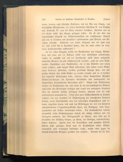 treten, sondern auch städtische Behörden, wie der Rat von Leipzig , dastnrsächsische Ministerium, die beiden Kurfürsten Christian II. von Sachsenund Friedrich IV. von der Pfalz einander berichten, schreiben und anden Kaiser selbst ihre Klagen gelangen lassen. Es ist also über denungesetzlichen Eingriff der Büchertommission ein vollständiger Beweisaus den in Dresden und Frankfurt aufbewahrten zehn Briefen und Be-richten erbracht. Während von diesen übrigens nur der letzte vom19. Juli 4609 sich in Frankfurt findet, sind die neun ersten im dres-dener Hofstaatsarchiv aufbewahrt. ^