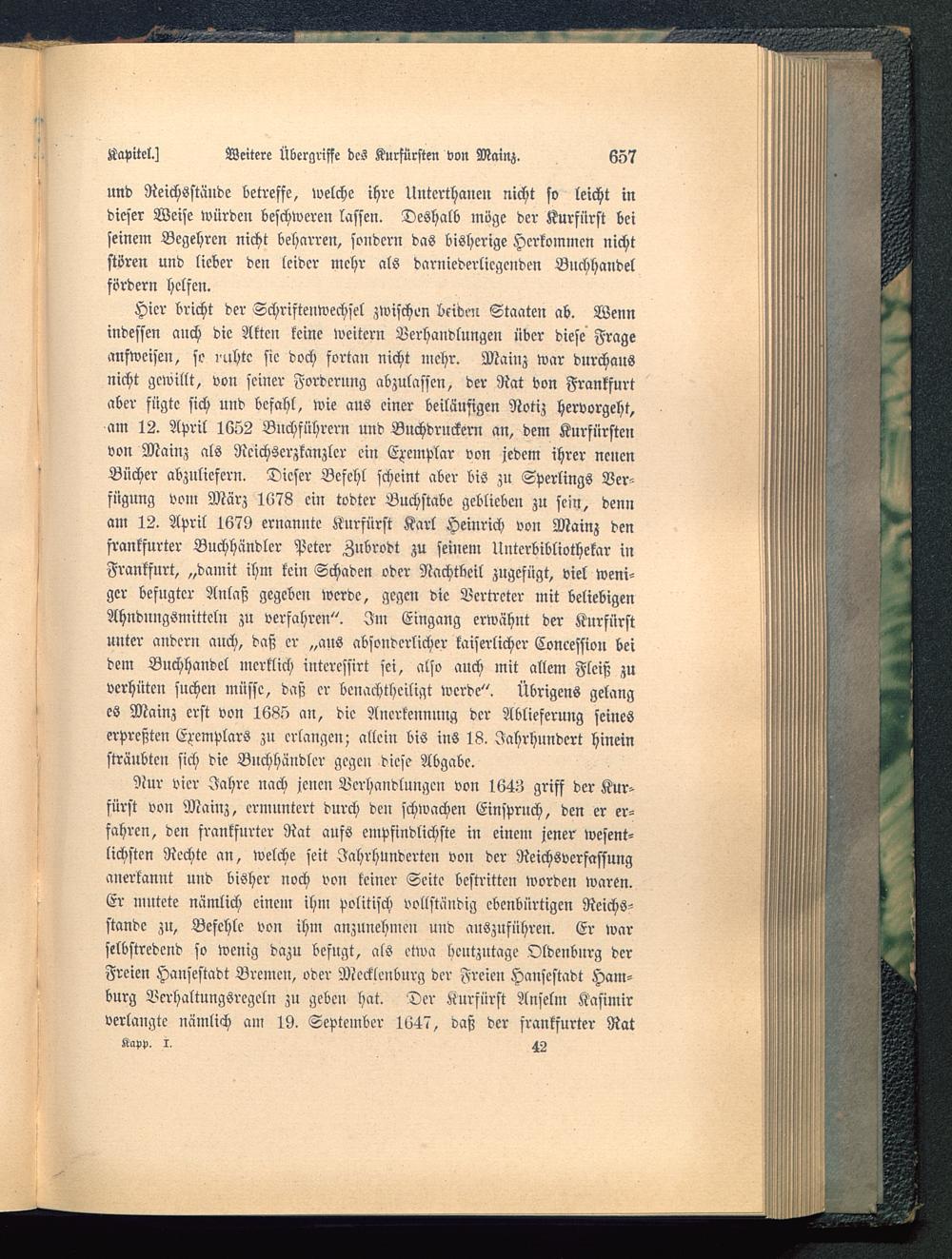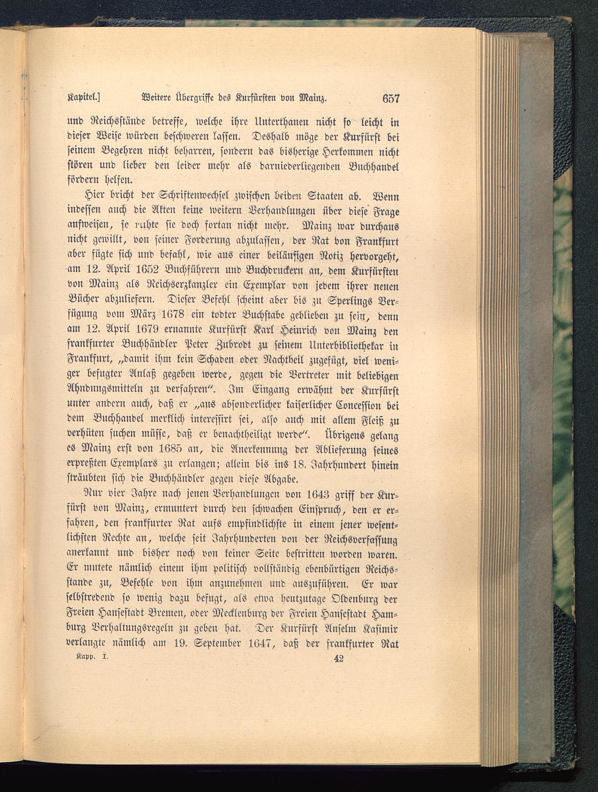 Hier bricht der Schriftenwechsel zwischen beiden Staaten ab. Wennindessen auch die Akten keine weitern Verhandlungen über diese Frageanfweisen, so ruhte sie doch fortan nicht mehr. Mainz war durchausnicht gewillt, von seiner Fordcrnng abzulassen, der Rat von Frankfurt aber fügte sich und befahl, wie aus einer beiläufigen Notiz hervorgeht,am 12. April 1652 Bnchführcrn und Buchdruckern an, dem Kurfürstenvon Mainz als Rcichserzkanzlcr ein Exemplar von jedem ihrer ncncnBücher abzuliefern. Dieser Befehl scheint aber bis zu Sperlings Ver-fügung vom März 1678 ein todter Buchstabe geblieben zu sein, dennam 12. April 1679 ernannte Kurfürst Karl Heinrich von Mainz denfrankfurter Buchhändler Peter Zubrodt zu seinem Unterbibliothekar inFrankfurt , „damit ihm kein Schaden oder Nachtbeil zugefügt, viel weni-ger befngtcr Anlaß gegeben werde, gegen die Vertreter mit beliebigenAhndnngsmitteln zu verfahren". Im Eingang erwähnt der Kurfürstunter andern auch, daß er „aus absonderlicher kaiserlicher Concession beidem Buchhandel merklich interessirt sei, also auch mit allem Fleiß zuverhüten suchen müsse, daß er bcnachtheiligt werde". Übrigens gelanges Mainz erst von 1685 an, die Anerkennung der Ablieferung seineserpreßten Exemplars zu erlangen; allein bis ins 18. Jahrhundert hineinsträubten sich die Buchhändler gegen diese Abgabe.