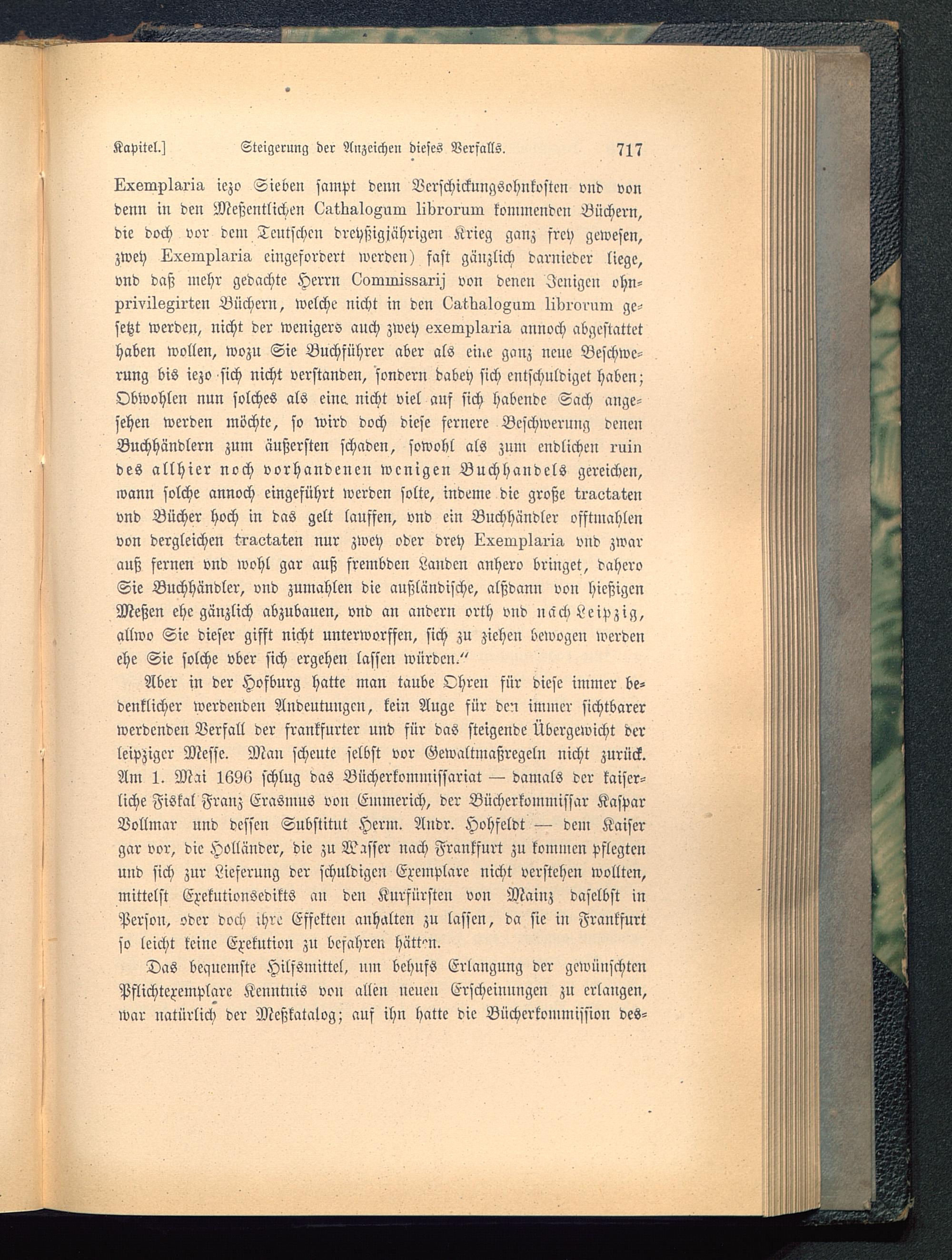 Aber in der Hofburg hatte man taube Ohren für diese immer be-denklicher werdenden Andeutungen, kein Auge für den immer sichtbarerwerdenden Verfall der frankfurter und für das steigende Übergewicht derleipziger Messe . Man scheute selbst vor Gewaltmaßregeln nicht zurück.Am 1. Mai 1696 schlug das Bücherkommissciriat — damals der kaiser-liche Fiskal Franz Erasmus von Emmerich, der Bücherkommissar KasparVollmar und dessen Substitut Herm. Andr. Hohfeldt — dem Kaisergar vor, die Holländer, die zu Wasser nach Frankfurt zu kommen pflegtenund sich zur Lieferung der schuldigen Exemplare nicht verstehen wollten,mittelst Exekutionsedikts an den Kurfürsten von Mainz daselbst inPerson, oder doch ihre Effekten anhalten zu lassen, da sie in Frankfurt so leicht keine Exekution zu befahren hätt-m.