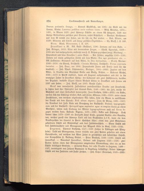 Frankfurt a. M. Nik. Basse (Bassäus), 1596: Fortuna auf dem Rade. -Joh. Bringer, 1613: Altar mit brennendem Herzen. — Christ. Egenolph, 1533—1555:wie das vorhergehende,vielleicht vonH.S. Beham gezeichnet (vergl. Marburg ). —Feyerabend und seine Genossen s. unter Basel . — Pet. Fischer, ungefähr 1582—1591:Saturn ans einem geflügelten Hirsch mit dem Motto: Rss s^s pruüevter sto. —Nik. Hoffmann: Ganymed auf dem Adler, In veo Isstrmäum. - Matth. Merian:1593—1650: ein Storch, Beischrift: lüionnia Hlsriani, Umschrift: I'iews LovtsutaInoratur. — Joh. Saur, vor 1600: Feyerabends Fama und Devise (weil für ihndruckend). — Joh. Theob. Schönwetter, Verleger, 1601—1603: Jupiter auf demAdler, in Drucken von Matthäus Becker und Wolfg. Richter. — Andreas Wcchel,1535—1573 in Paris etabliert, dann als Hugcnot ausgewandert und Ins in dieneunziger Jahre in Frankfurt thätig: der Caduccus mit zwei Füllhörnern, darüberder Pegasus; dasselbe Signet führen Wechels Erben in Frankfurt und Hanau um1597 und später. — Joh. Wolfs, um 1565: Noahs Opfer.