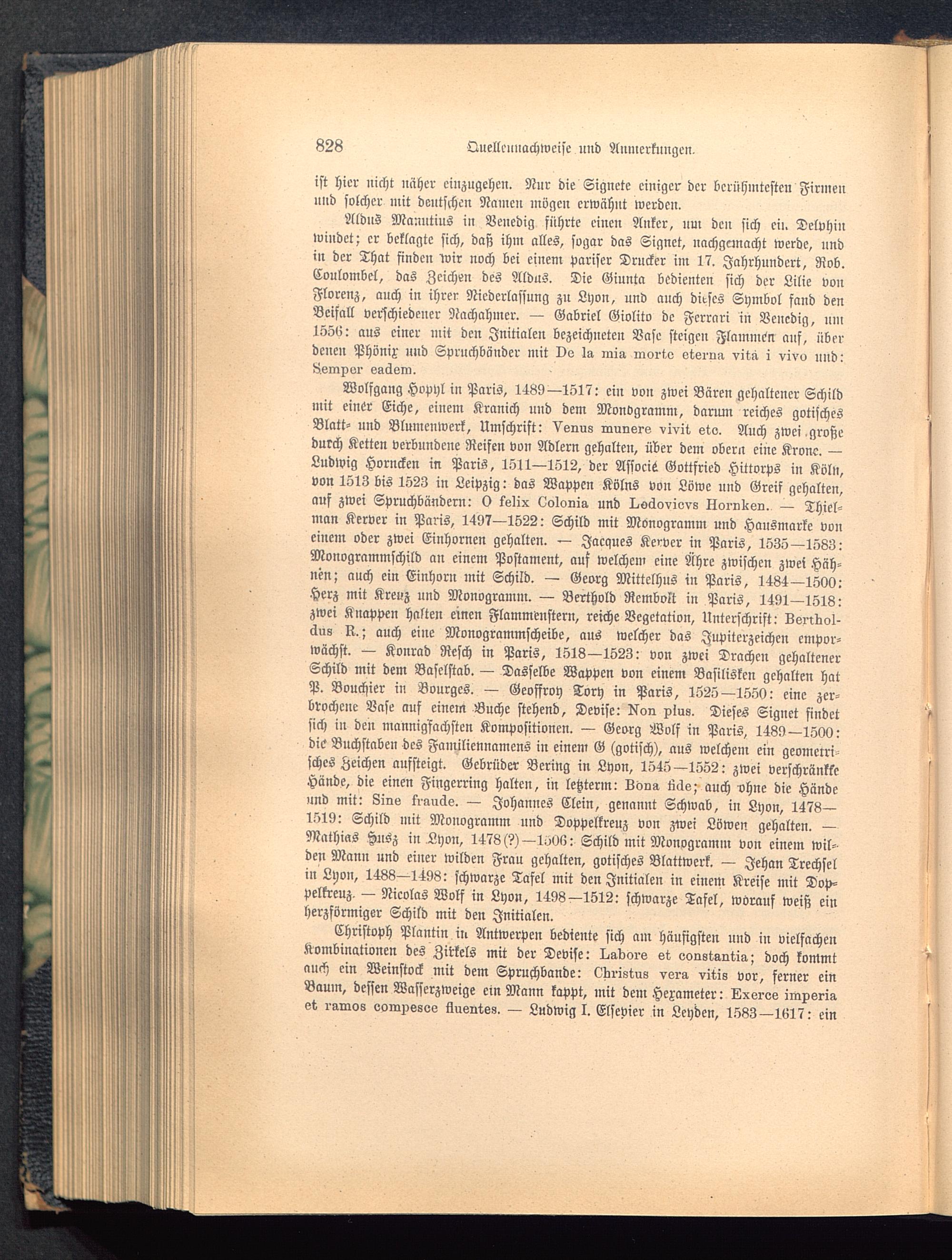 Wolfgang Hvpyl in Paris , 1489—1517: ein von zwei Bären gehaltener Schildmit einer Eiche, einem Kranich und dem Mondgramm, danun reiches gotischesBlatt- und Blumeuwcrk, Umschrift: Ve-nug raurisrs vivit sto. Auch zwei .großedurch Ketten verbundene Reifen von Adlern gehalten, über dem obern eine Kronc. —Ludwig Horncken in Paris, 1511—1512, der Associe Gottfried Hittorvs in Köln ,von 1513 bis 1523 in Leipzig: das Wappen Kölns von Löwe nnd Greif gehalten,auf zwei Spruchbändern: O tslix Oolonia und I^oäoviov8 Loi-nKen. — Thiel-mcm Kerver in Paris, 1497—1522: Schild mit Monogramm und Hausmarke voneinem oder zwei Einhornen gehalten. — Jacques Kerver in Paris , 1535—1583:Monogrammschild an einem Postament, auf welchem eine Ähre zwischen zwei Häh-nen; auch ein Einhorn mit Schild. — Georg Mittelhns in Paris , 1484—1500:Herz mit Kreuz und Monogramm. — Berthold Rcmboit in Paris, 1491—1518:zwei Knappen halten einen Flammenstern, reiche Vegetation, Unterschrift: Lsildol-äu8 K.; auch eiue Monogrammscheibe, aus welcher das Jupiterzeichen empor-wächst. — Konrad Resch in Paris , 1513—1523: von zwei Drachen gehaltenerSchild mit dem Baselstab. — Dasselbe Wappen von einem Basilisken gehalten hatP. Bouchier in Bourges. — Geoffroy Tory in Paris , 1525—155V: eine zer-brochene Vase auf einem Buche stehend, Devise: 5lon plus. Dieses Signet findetsich iu den mannigfachsten Kompositionen. — Georg Wolf in Paris , 1489—1500:die Buchstaben des Familiennamens in einem G (gotisch), nus welchem ein geomctrisches Zeichen aufsteigt. Gebrüder Bering in Lyon, 1545—1552: zwei verschränkteHände, die einen Fingerring halten, in letzterm: Loo» tute; auch ohne die Händeund mit: Lins trancle. — Johannes Clein, genannt Schwab, in Lyon, 1478—1519: Schild mit Monogramm nnd Doppelkreuz von zwei Löwen gehalten. —Mathias Husz in Lyon, 1478 (?)—1/MZ: Schild mit Monogramm von einem wil-den Mann und einer wilden Frau gehalten, gotisches Blattwerk. — Jehan Trechselin Lyon, 1488—1498: schwarze Tafel mit den Initialen in einem Kreise mit Dop-pclkreuz. — Nicolas Wolf in Lyon, 1498—1512: schwarze Tafel, worauf weiß einherzförmiger Schild mit den Initialen.