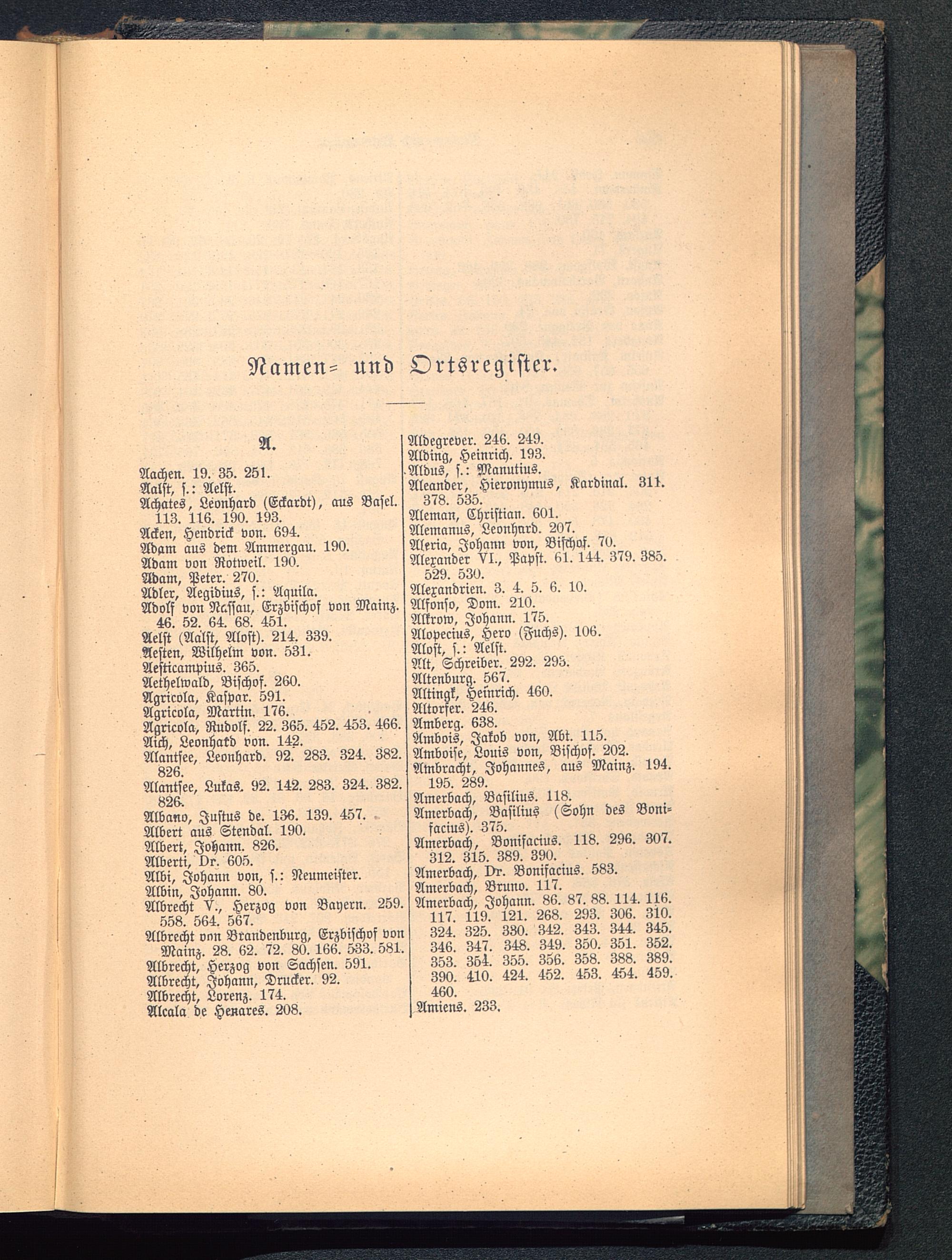 Mainz . 28. 62. 72. 80. 166. 533. 581.Albrecht, Herzog von Sachsen. 591.Albrecht, Johann, Drucker. 92.Albrecht, Lorenz. 174.Alcala de Henares . 208.