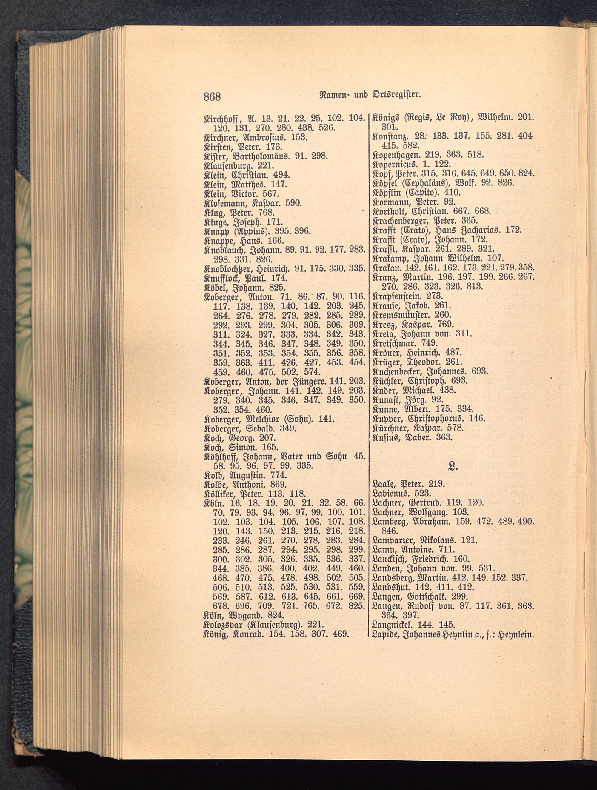 58. 95. 96. 97. 99. 335.Kolb, Augustin. 774.Kolbe, Anthoni. 869.Kölliker, Peter. 113. 118.Köln . 16. 18. 19. 20. 21. 32. 58. 66.