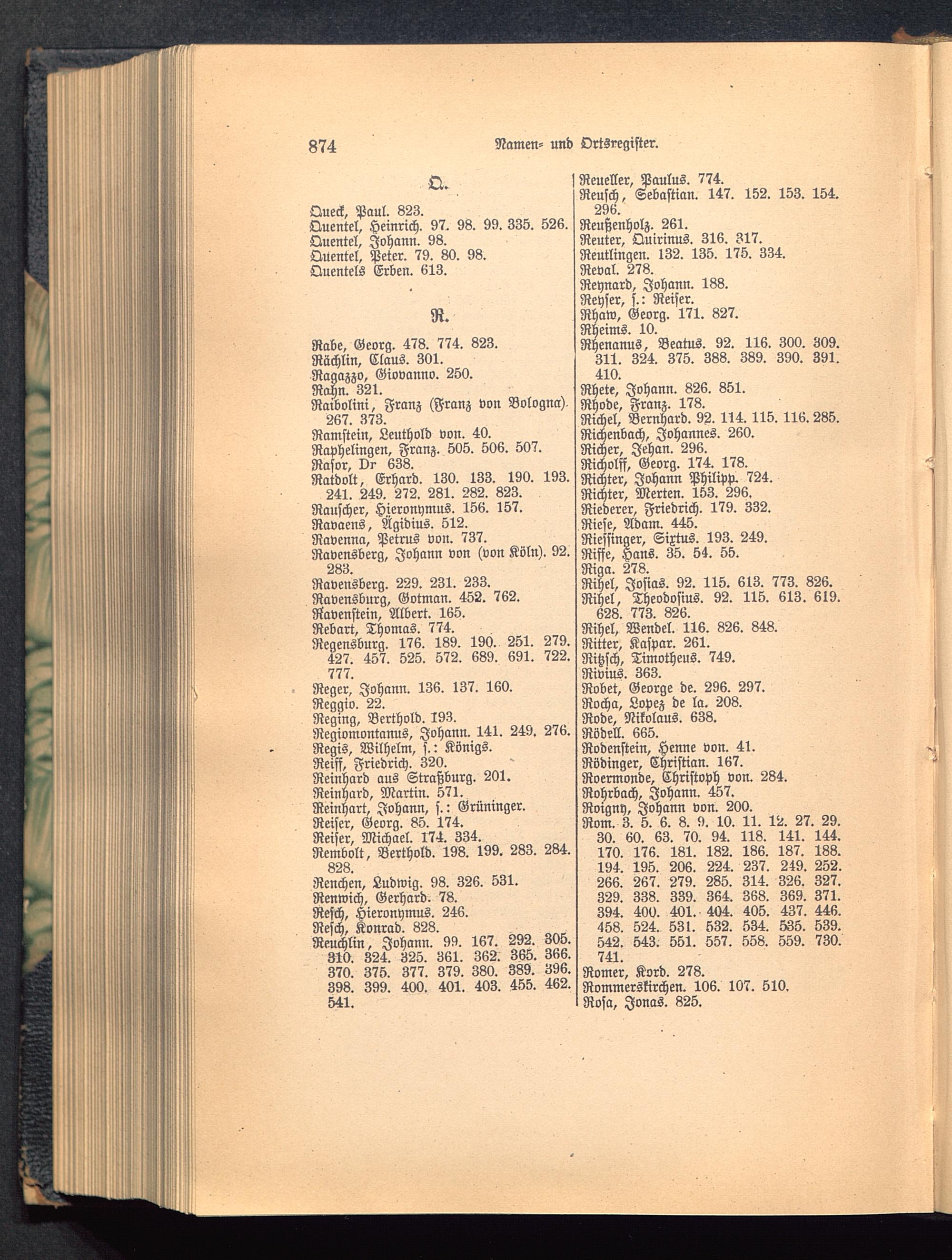 Reger, Johann. 136. 137. 160.Reggio. 22.Reging, Berthold. 193.Regiomontanus, Johann. 141. 249. 276.Regis, Wilhelm, s.: Königs.Reifs, Friedrich. 320.Reinhard aus Straßburg . 201.Reinhard, Martin. 571.Reinhart, Johann, s.: Grüninger.Reiser, Georg. 85. 174.Reiser, Michael. 174. 334.Rembolt, Berthold. 198. 199. 283. 234.828.