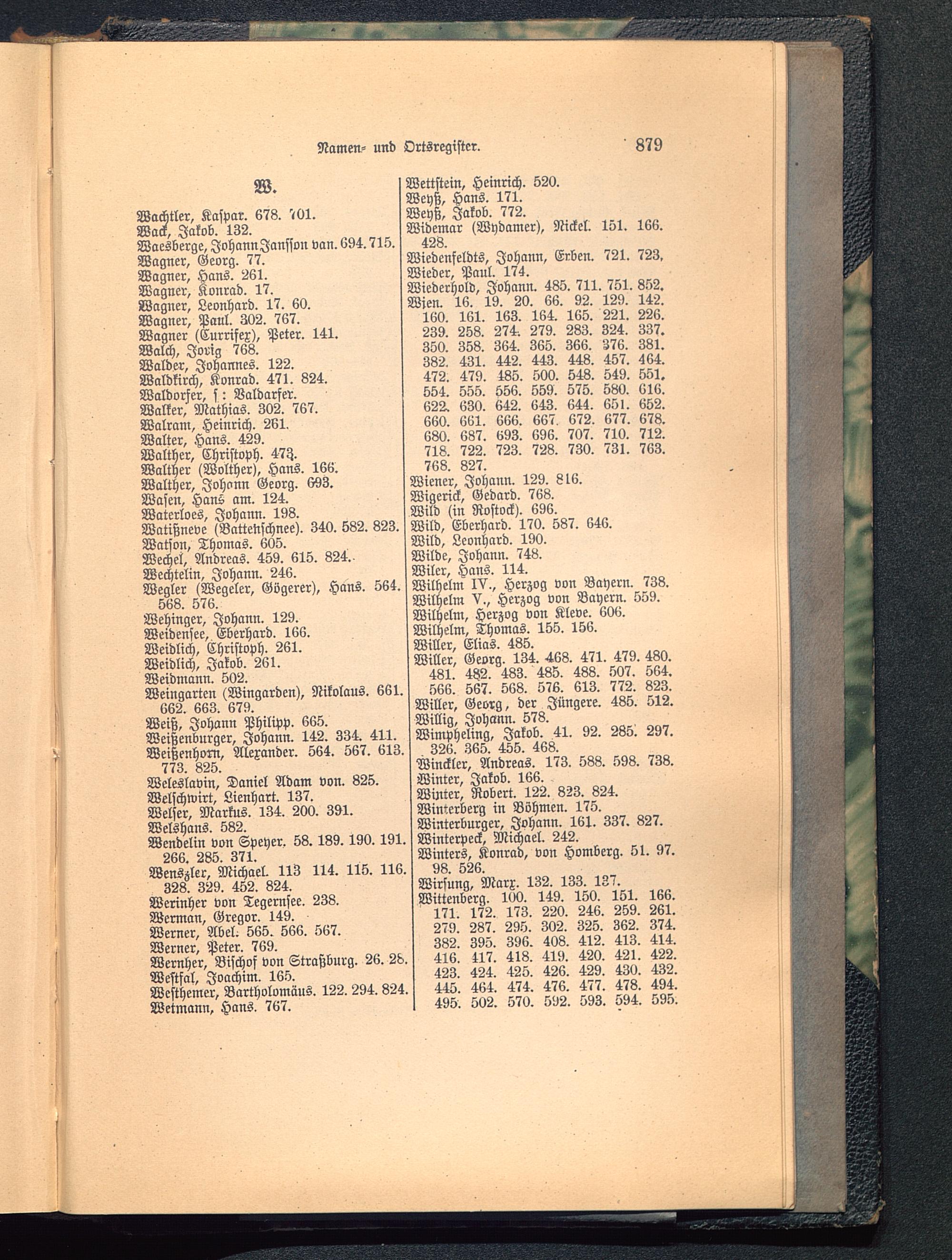 Wilhelm IV. , Herzog von Bayern. 738.Wilhelm V., Herzog von Bayern . 559.Wilhelm, Herzog von Kleve . 606.Wilhelm, Thomas. 155. 156.Willer, Elias. 435.
